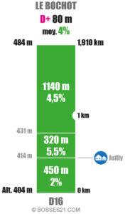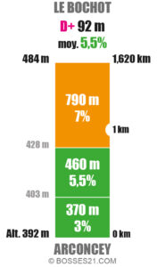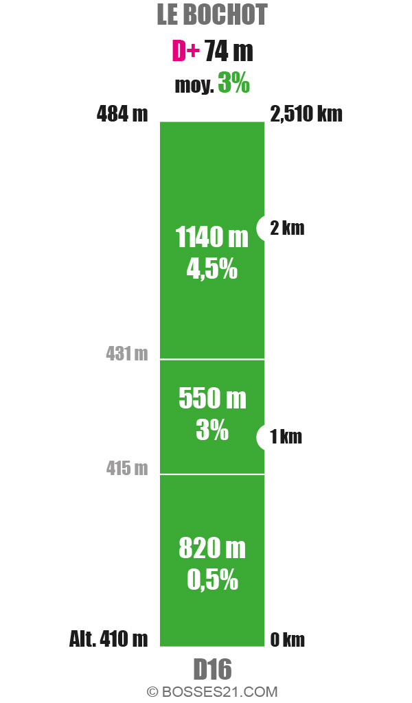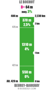Le Bochot est un point haut situé à 484 m d’altitude. Son ascension comporte 4 variantes ne présentant pratiquement aucune difficulté majeure à part une rampe de 790 m à 7% pour celle au départ d’Arconcey.