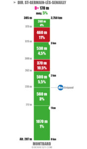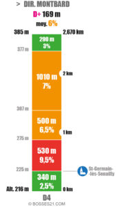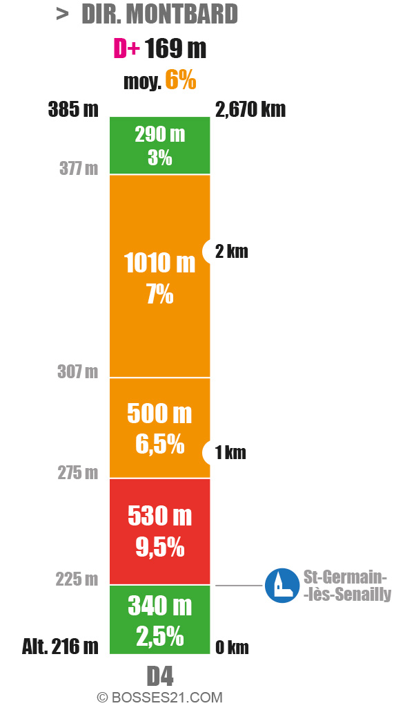 Cette ascension permet de passer entre les Vallées de la Brenne (Montbard) et de l’Armançon (St-Germain-lès-Senailly). Son point haut est situé à 385 m d’altitude. Cette dernière, modeste, n’empêche pas de se confronter à des passages relativement ardus !