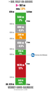 Une ascension reliant Verrey-sous-Salmaise (Vallée de L’Oze) à Villy-en-Auxois (Vallée de l’Ozerain) avec de belles vues sur les vallées. La pente est très régulière pour sur chacun des 2 versants qui franchissent un point culminant situé à 478 m d’altitude via la D26. Une variante supplémentaire est possible en empruntant une route communale (intégralement asphaltée en 2025) qui mène à la Ferme du Giboux mais là, ce sera beaucoup moins facile avec un abominable raidard de 1070 m à 12% de moyenne !