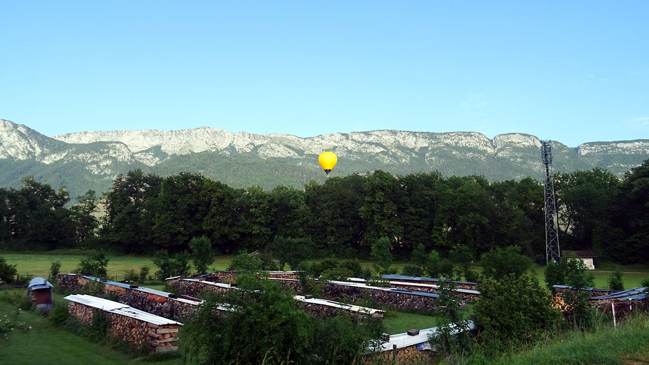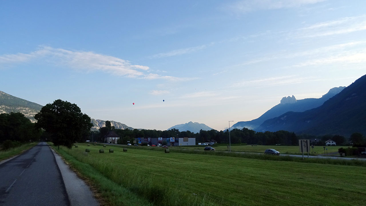Après un bon petit-déjeuner et m’être mis en tenue (je prépare toujours mon vélo, les bidons, l’alimentation et le guidage GPS la veille au soir), je démarre à 7h30. Comme d’habitude, depuis Doussard, j’emprunte la Voie verte pour me rendre au point de départ de ma première ascension. Je l’adore, c’est vraiment pratique pour rallier toutes les ascensions qui entourent le Lac d’Annecy. Calme et sans difficulté aucune, elle me permet de m’échauffer tranquillement tout en profitant du magnifique décor offert par les sommets alentour. Et il y a toujours un truc particulier à voir, là ce matin, c’est des vols de montgolfières. J’en compte 4 en prenant la direction d’Annecy et j’en croise une autre qui décolle à Brédannaz.