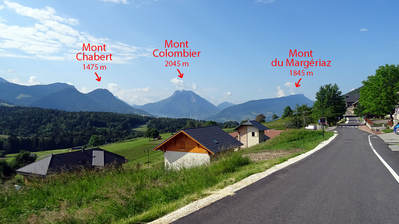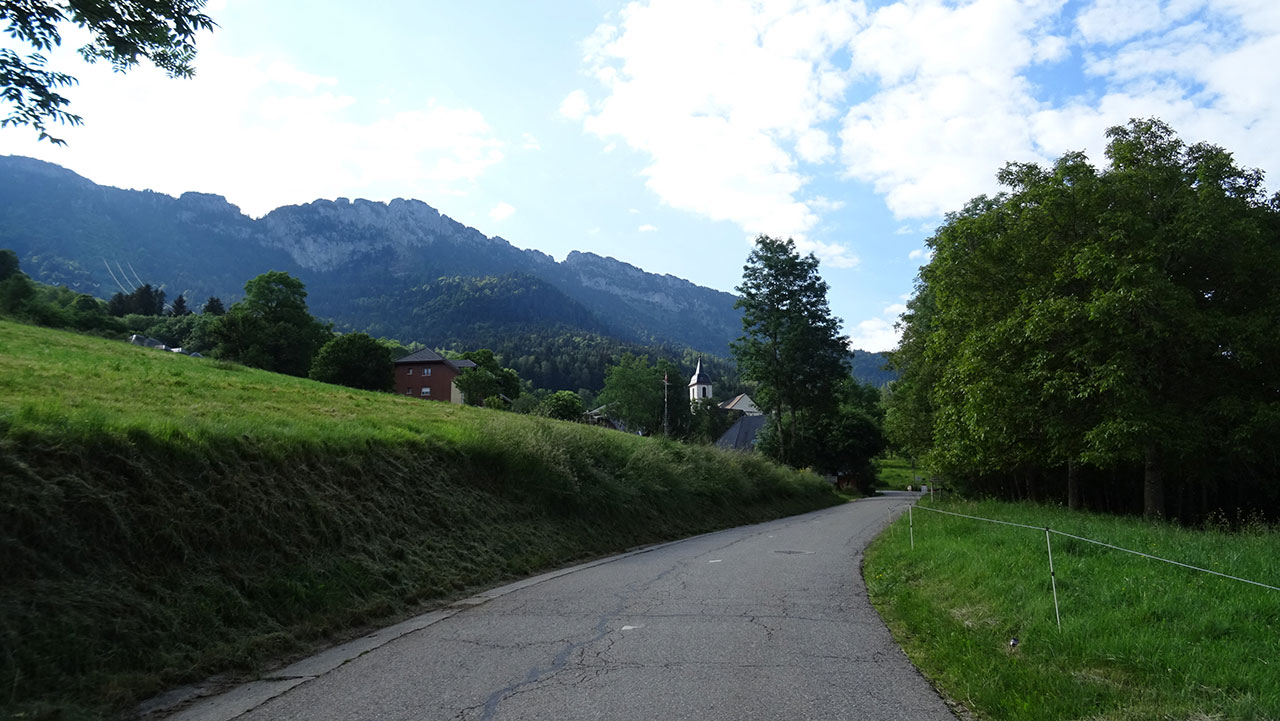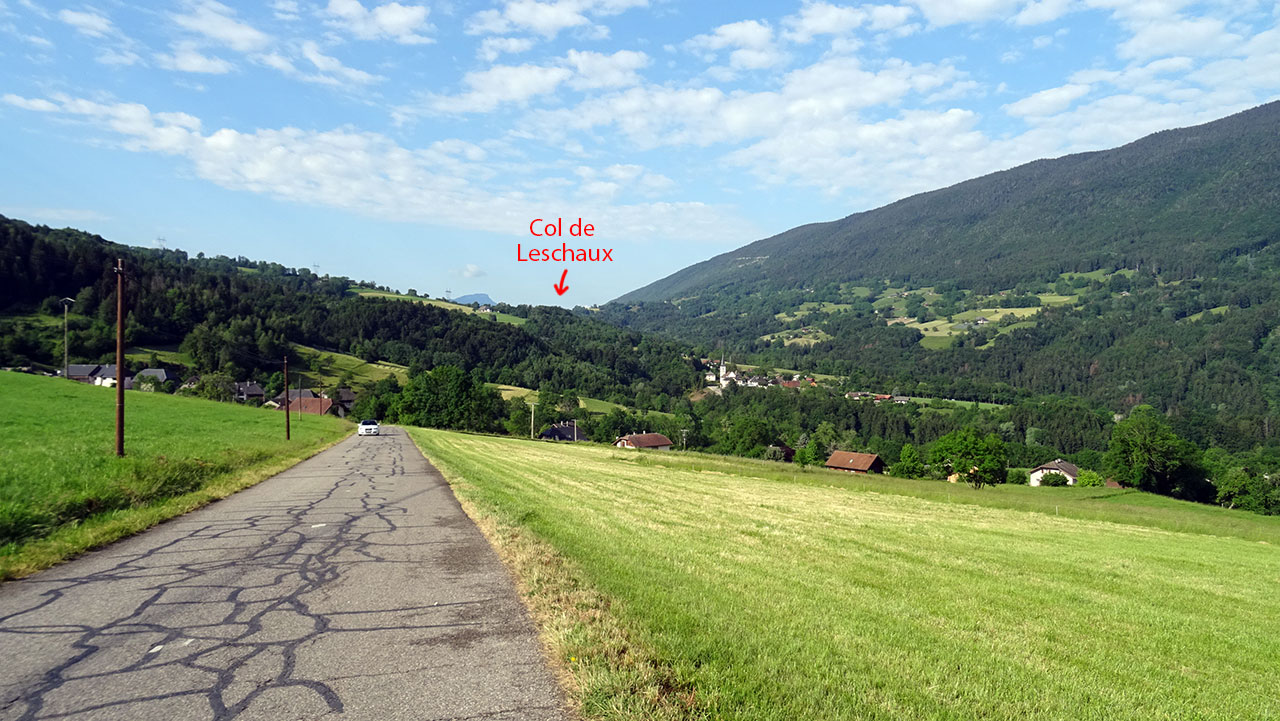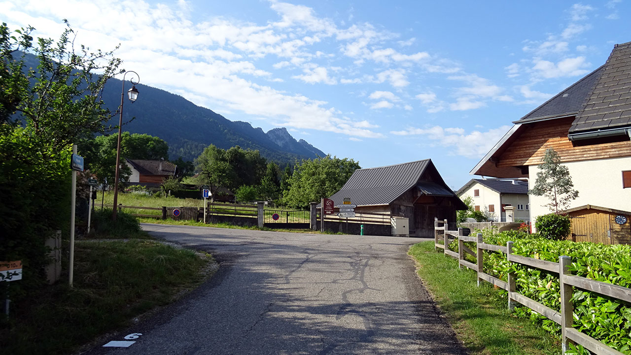 Allez c’est parti. Je démarre pour une petite rampe de 600 m à 5,5% qui me hisse à Leschaux. La traversée de ce dernier – longue de 750 m – est assez facile car il faut enchaîner 2 descentes entrecoupées d’un faux plat montant. On peut aussi profiter d’une jolie vue sur le Massif des Bauges.