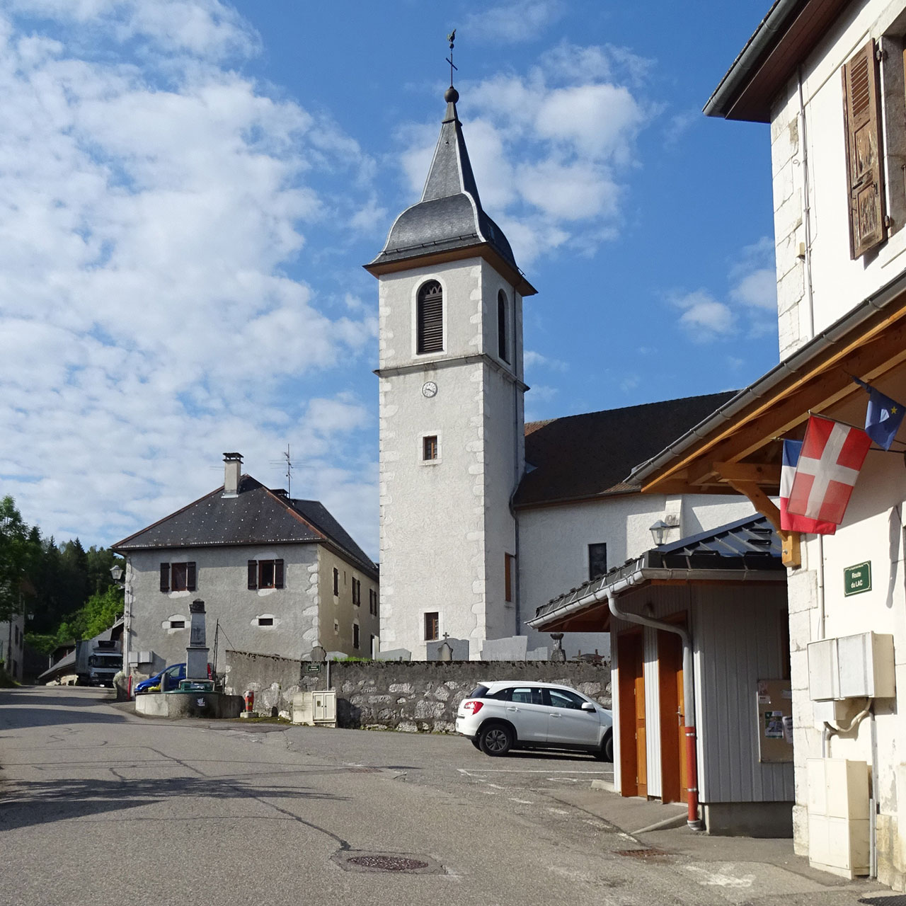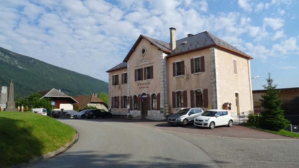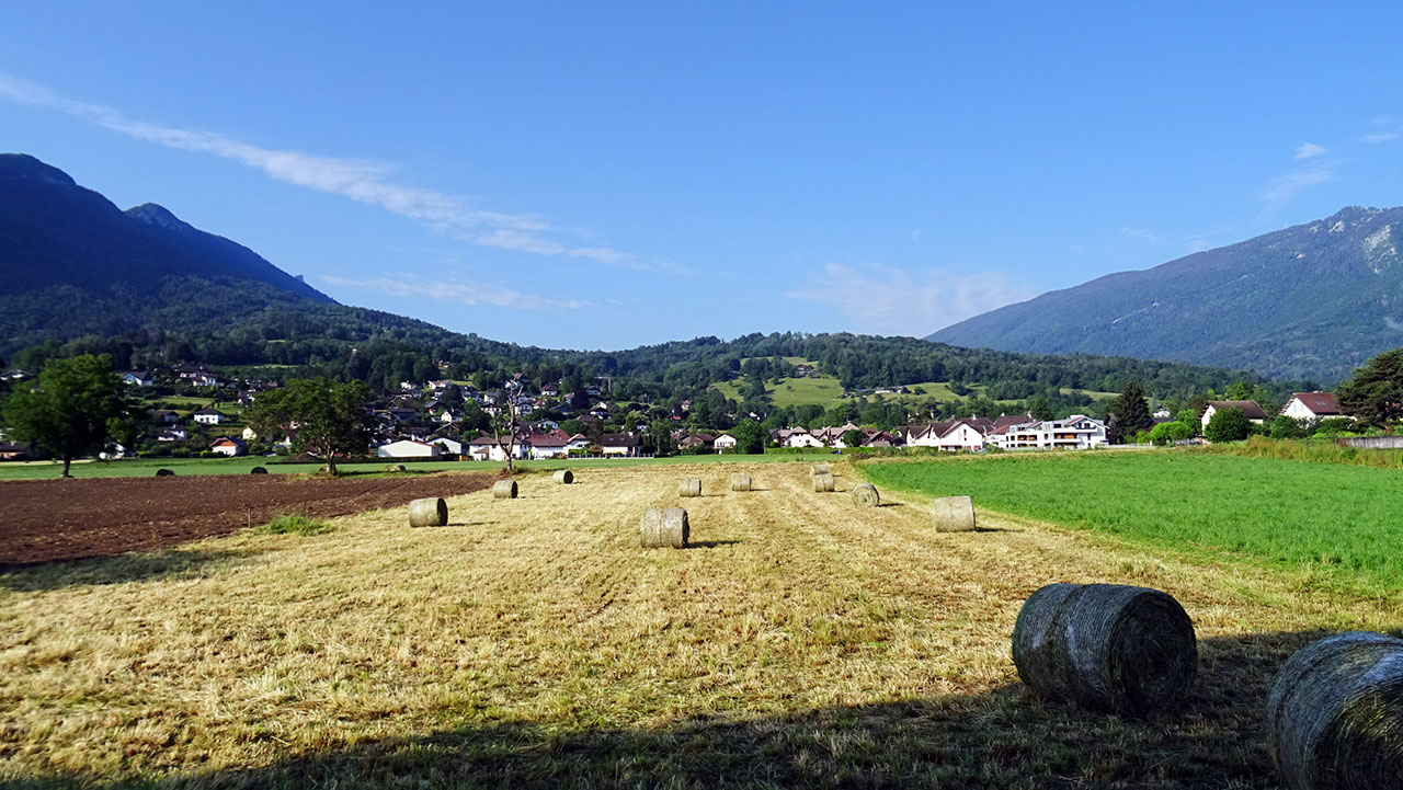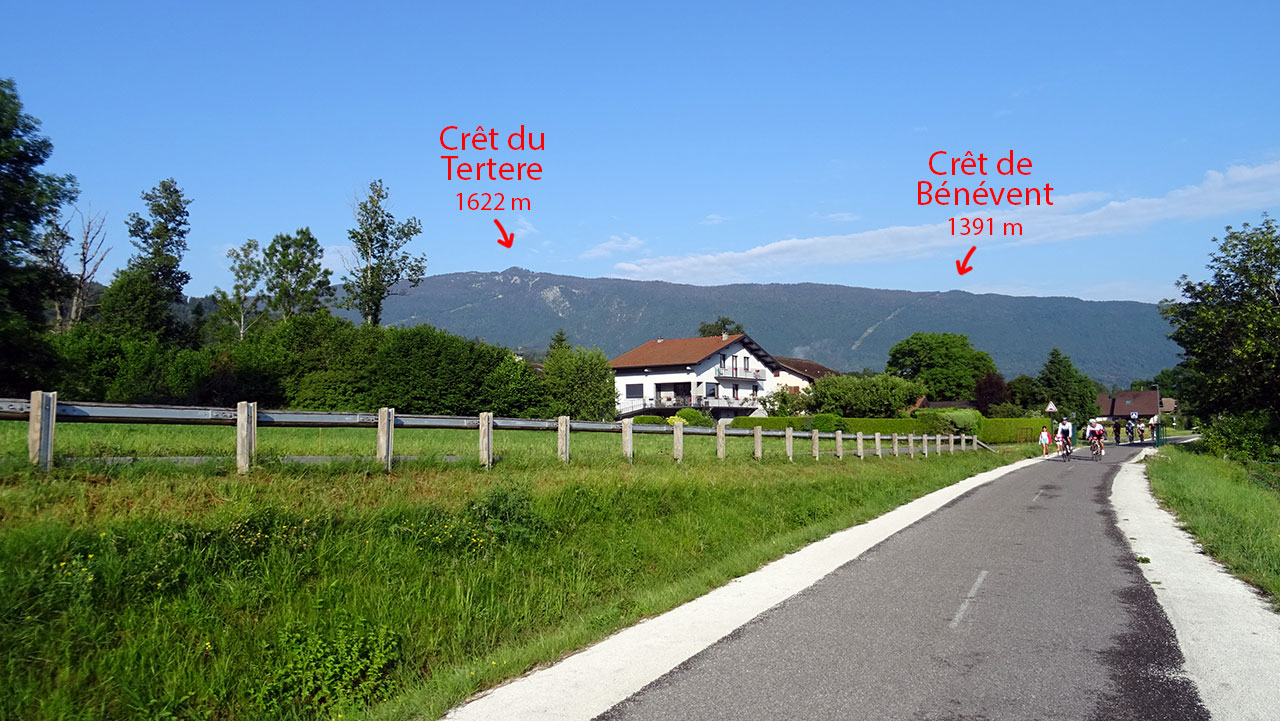 Allez c’est parti. Je démarre pour une petite rampe de 600 m à 5,5% qui me hisse à Leschaux. La traversée de ce dernier – longue de 750 m – est assez facile car il faut enchaîner 2 descentes entrecoupées d’un faux plat montant. On peut aussi profiter d’une jolie vue sur le Massif des Bauges.