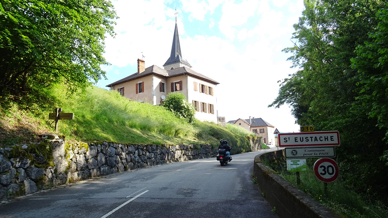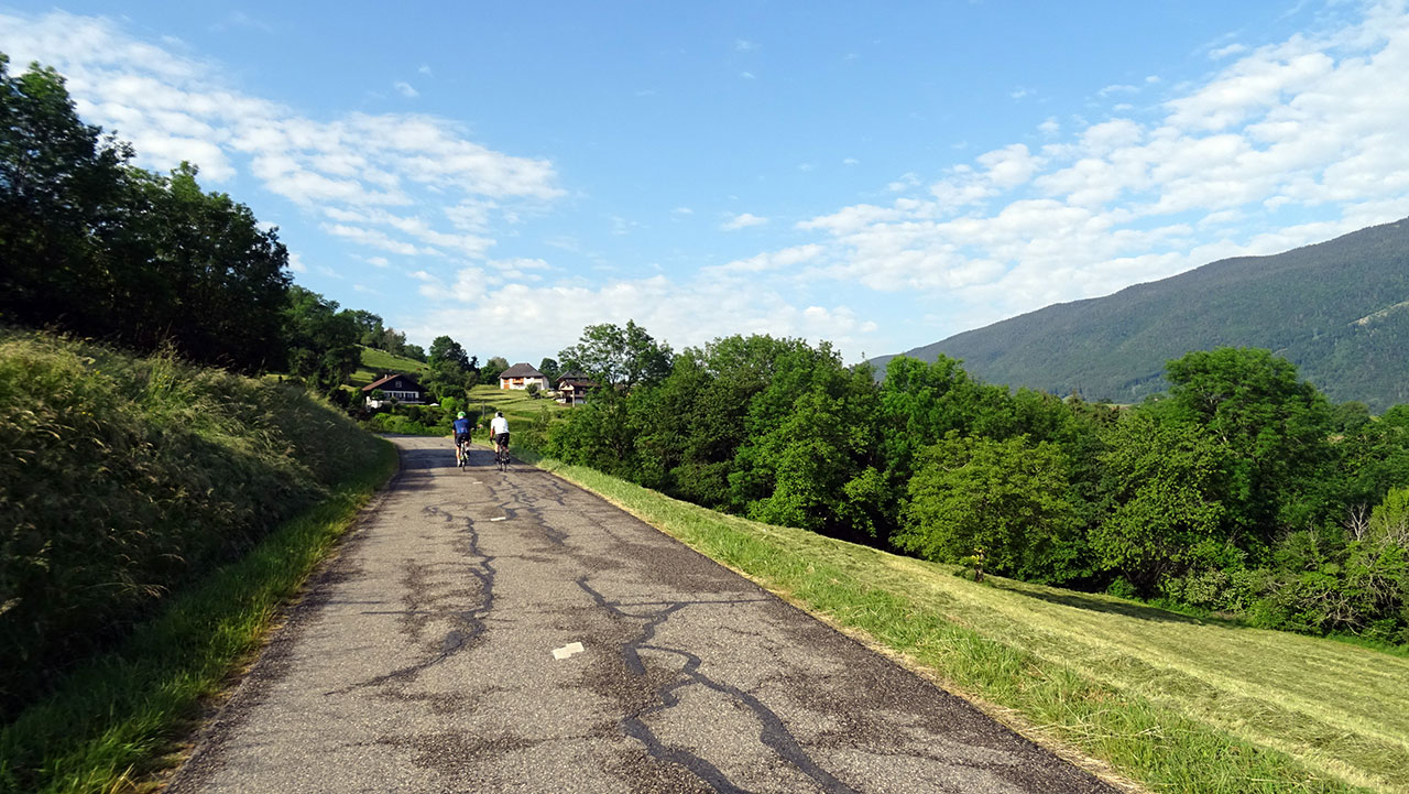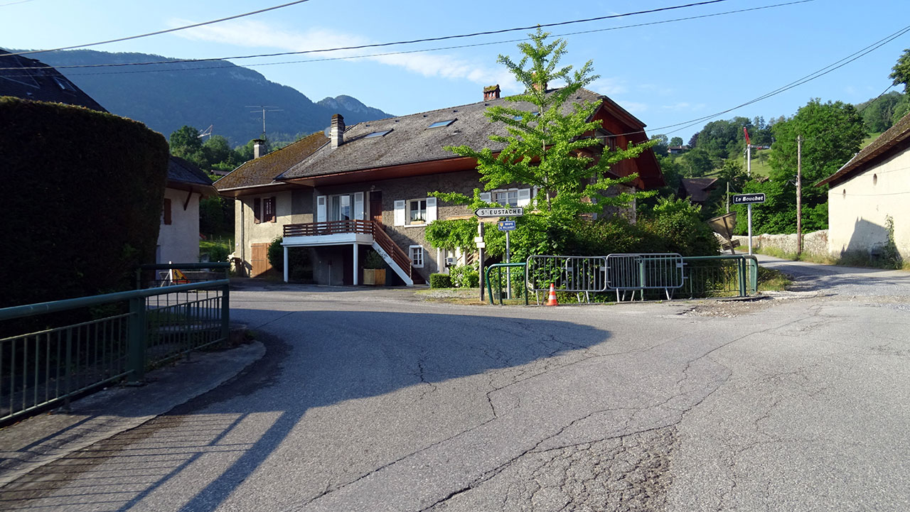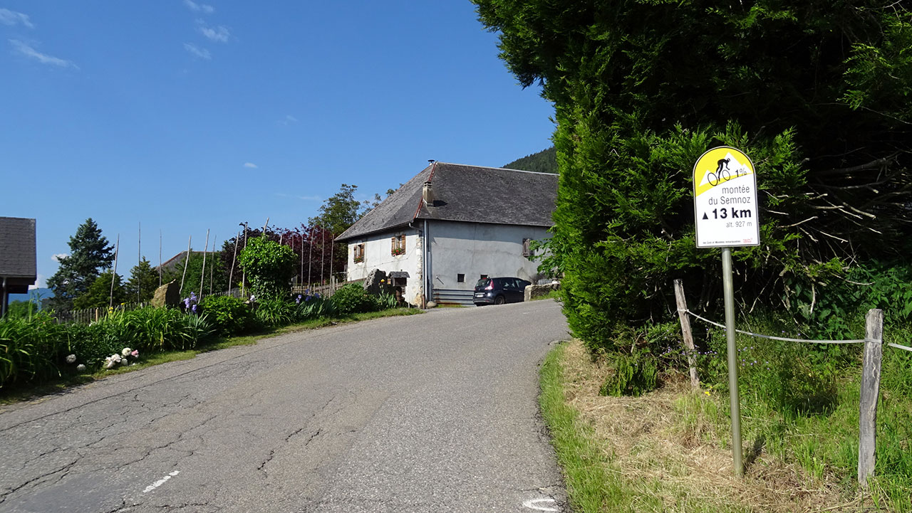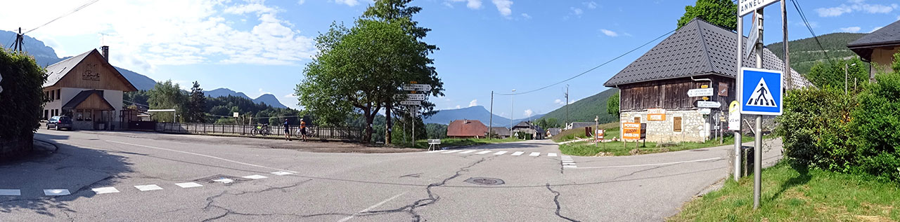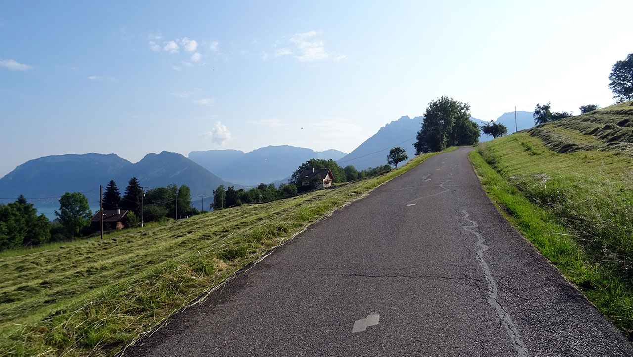 Cette variante longue de 13,5 km, emprunte les pieds du versant Est de la Montagne d’Entrevernes et du Roc des Bœufs qui ont la forme de grosses collines. La route passe par plusieurs hameaux et villages, dont les principaux sont St-Eustache et la Chapelle-St-Maurice. Son profil est beaucoup plus dur que le versant Nord traditionnel depuis Sévrier avec plusieurs passages à près de 7% de moyenne. Voilà une belle mise en jambe qui m’attend.
