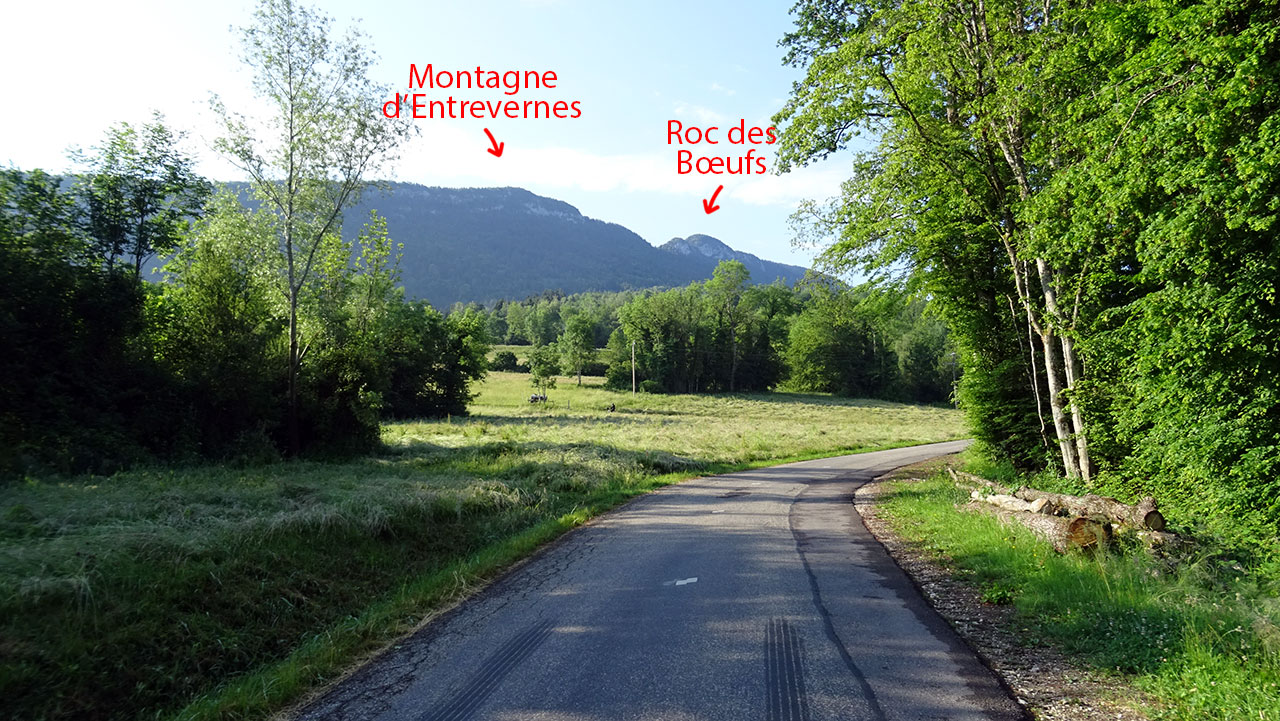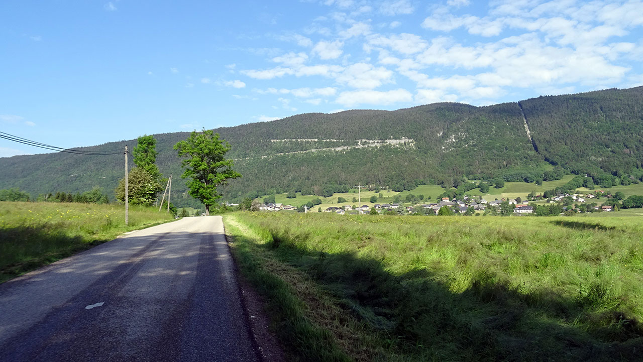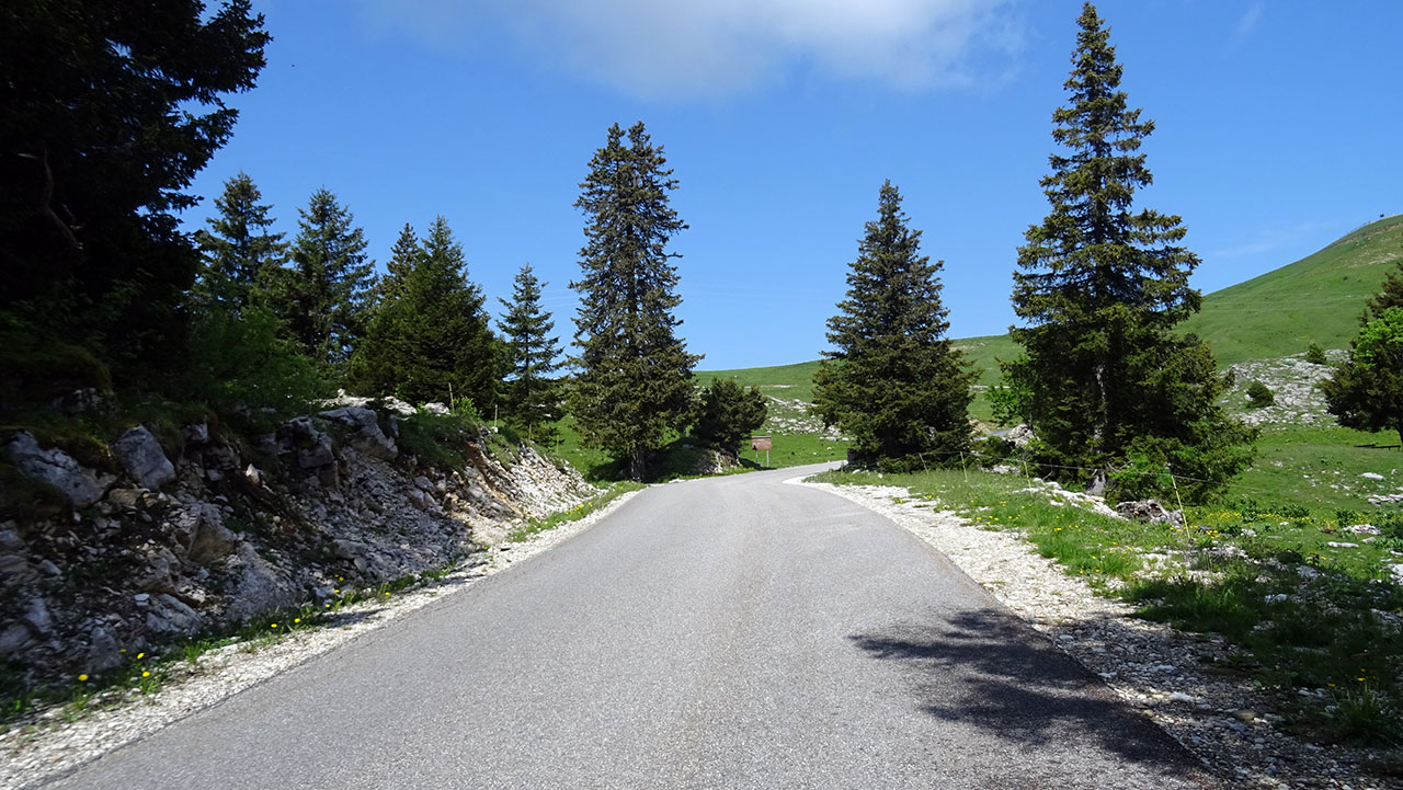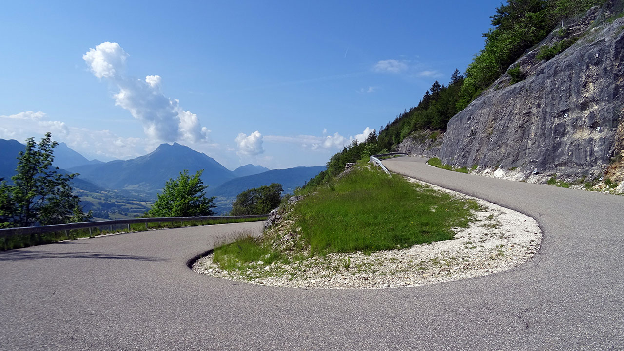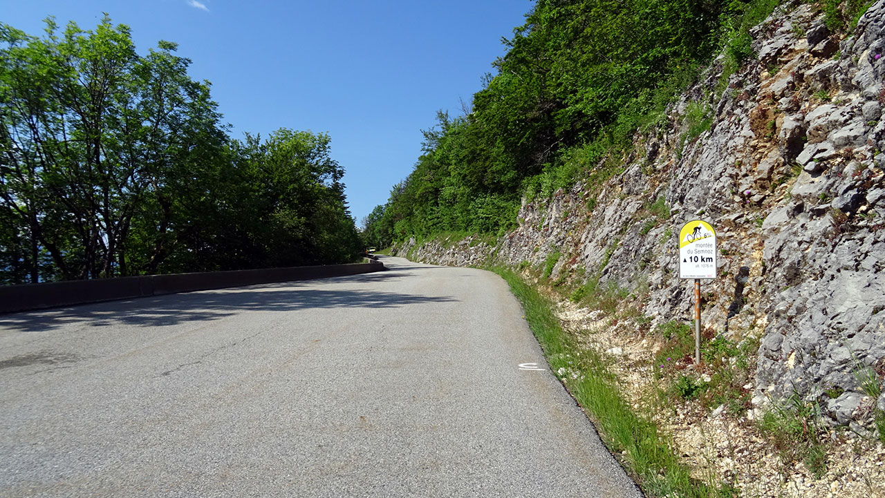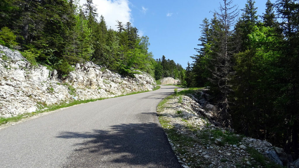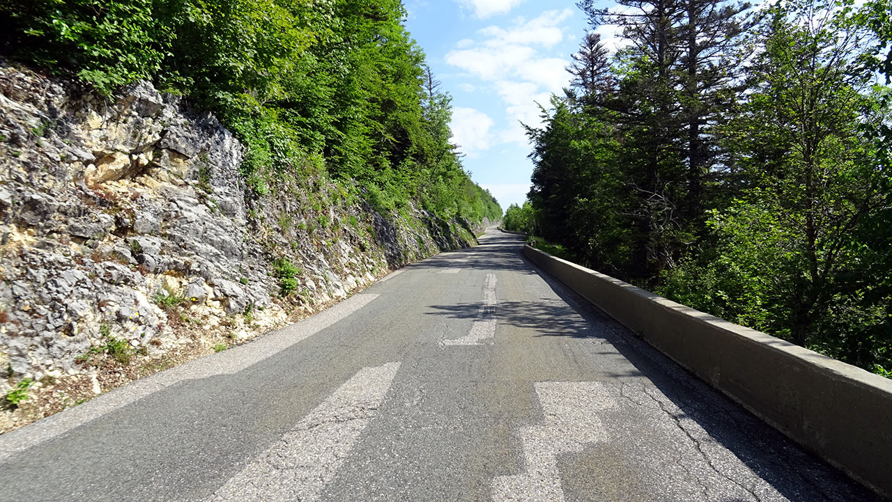 À l’issue d’une courte descente située à la sortie de Leschaux, la route amorce une remontée assez brusque – 350 m à 7,5% – puis aborde une série de 5 lacets répartie sur 5,4 km. La pente va osciller entre 6 et 7% sur une voie assez large. Cette dernière est bordée d’une paroi calcaire à sa gauche, et étant très exposée par rapport au soleil, il n’est pas rare que ce soit un vrai four l’après-midi en période estivale. En ce milieu de matinée, la chaleur n’est pas encore trop présente, ça me va parfaitement, moi qui ne l’aime pas trop.