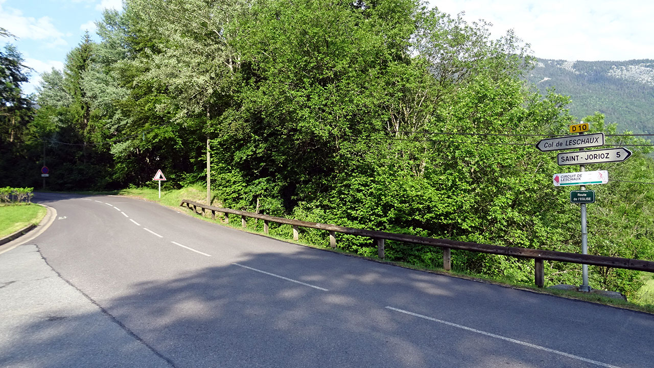 Après 13,7 km depuis Doussard, j’atteins St-Jorioz. Je quitte la piste la Voie verte pour emprunter la D10b et attaquer la première ascension de cette sortie : le Col des Leschaux (897 m). Je l’ai déjà gravi en 2015 par son versant Nord traditionnel depuis Sévrier. Sur mon site Alpes4ever, j’ai recensé pas moins de 10 variantes, c’était une occasion d’en découvrir une nouvelle et je n’en attendais pas moins qu’elle soit bien plus bucolique que son versant Nord traditionnel depuis Sévrier, déjà gravi en 2015, qui est sympa mais un tout petit peu monotone.