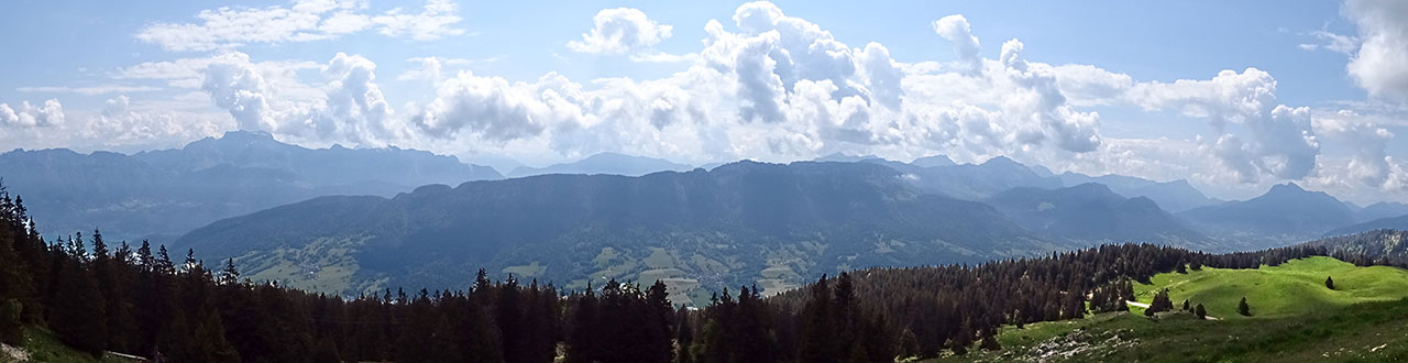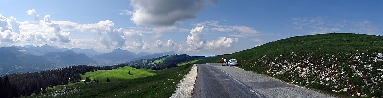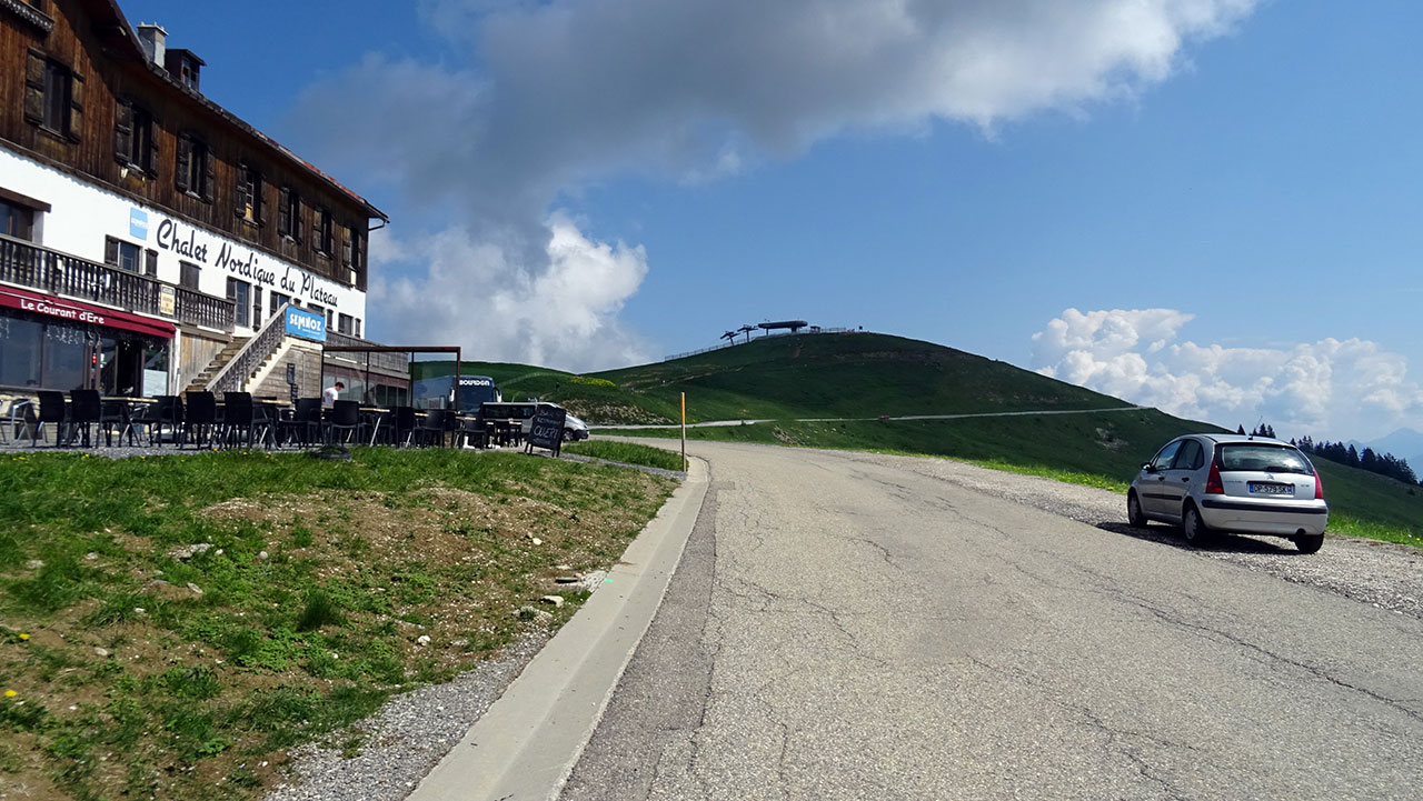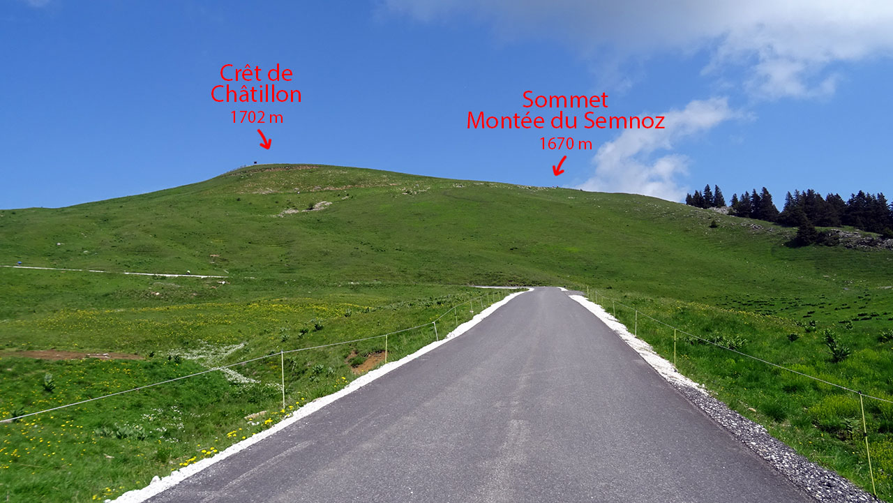 Les ascensions accumulées au cours de la semaine commencent à me peser un peu mais je sais que j’en ai bientôt terminé… Puis ma lassitude s’évanouit dans le dernier lacet qui sort de la forêt et qui offre une vue dégagée et magnifique sur les alpages d’un vert rayonnant qui entourent le sommet de la Montée du Semnoz (1670 m). Gardé par le Crêt de Châtillon tout proche, qui a 1702 m d’altitude, est le point culminant de la Montagne du Semnoz. On ne devrait d’ailleurs pas prononcer le « z » car le nom en arpitan est Semeno.