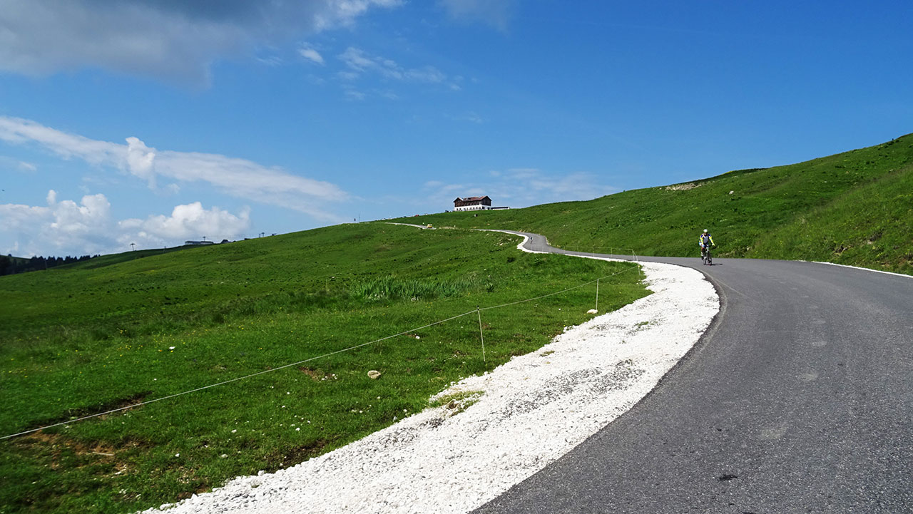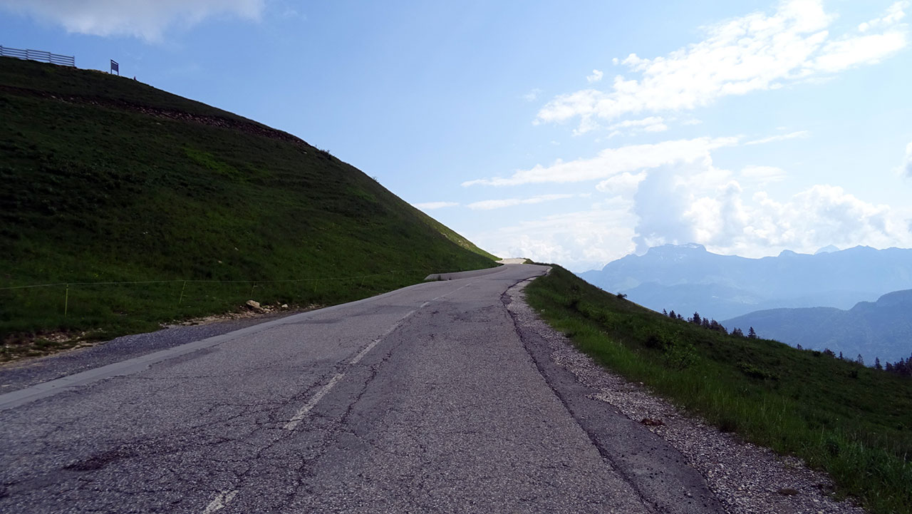 Je trouve un rythme qui me convient bien et grimpe patiemment les 5 lacets dont 3 sont relativement assez longs, ce qui accentue le fait de subir un peu plus la pente. J’apprécie l’instant car j’aime bien grimper des ascensions en dehors de la période touristique, il n’y a quasiment pas de circulation en ce milieu de semaine de début juin.
