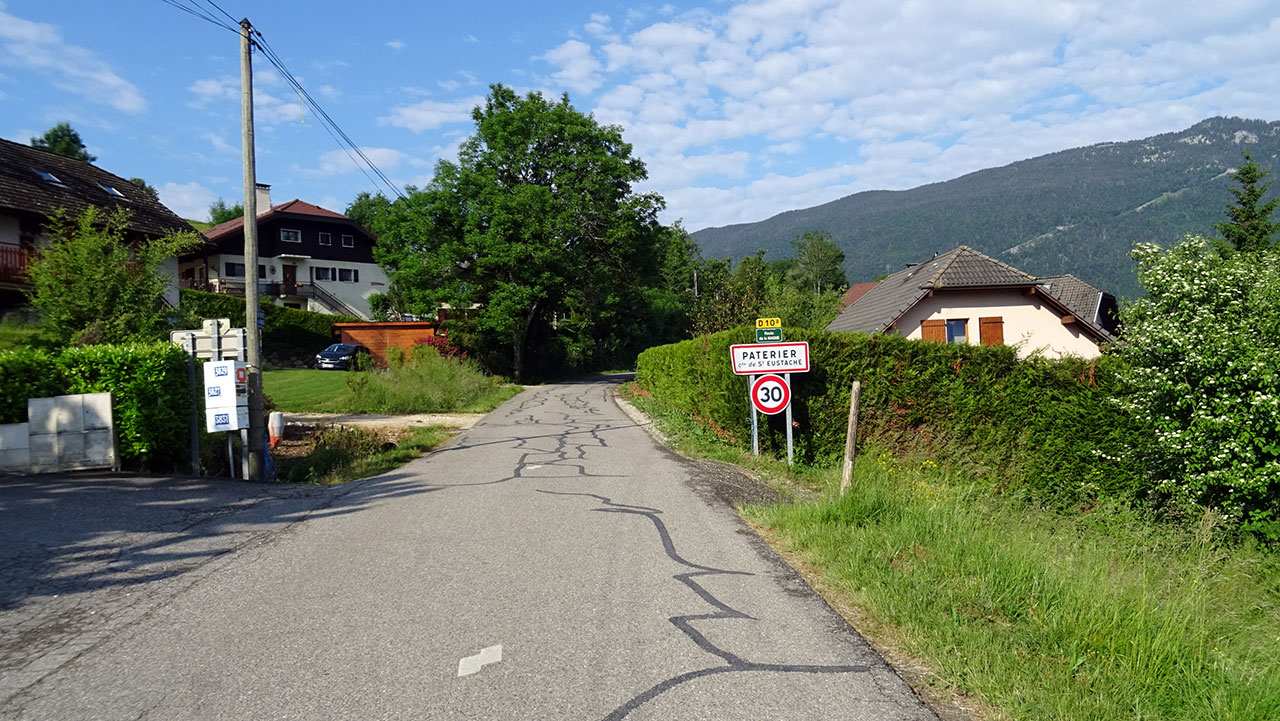 Cette variante longue de 13,5 km, emprunte les pieds du versant Est de la Montagne d’Entrevernes et du Roc des Bœufs qui ont la forme de grosses collines. La route passe par plusieurs hameaux et villages, dont les principaux sont St-Eustache et la Chapelle-St-Maurice. Son profil est beaucoup plus dur que le versant Nord traditionnel depuis Sévrier avec plusieurs passages à près de 7% de moyenne. Voilà une belle mise en jambe qui m’attend.