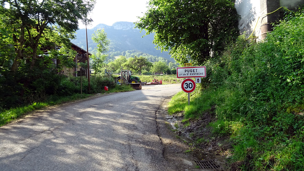 Au hameau du Puget, après 6 km depuis St-Jorioz, je franchis un premier point culminant situé à 795 m d’altitude. J’enchaîne avec une… descente. Longue de 1350 m à 7%, via le hameau du Cruet, elle me dépose à une intersection avec la D10.