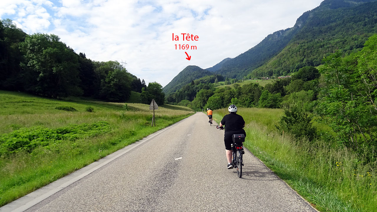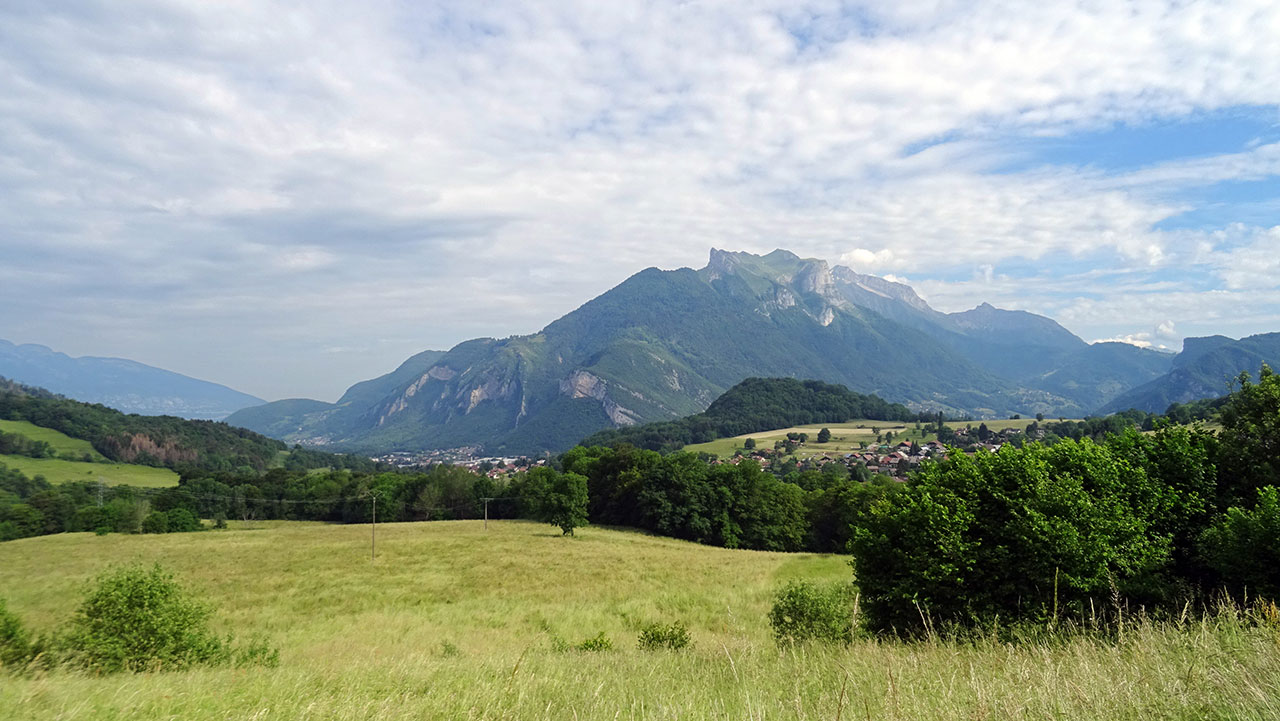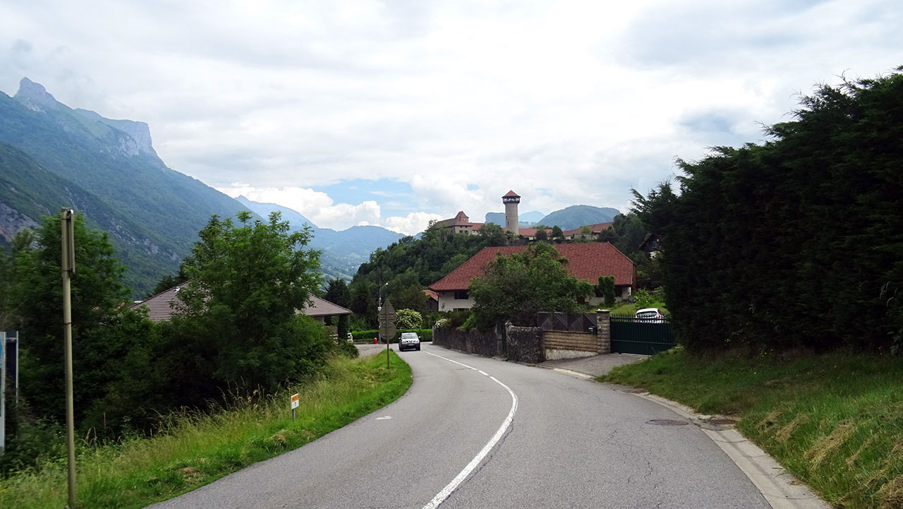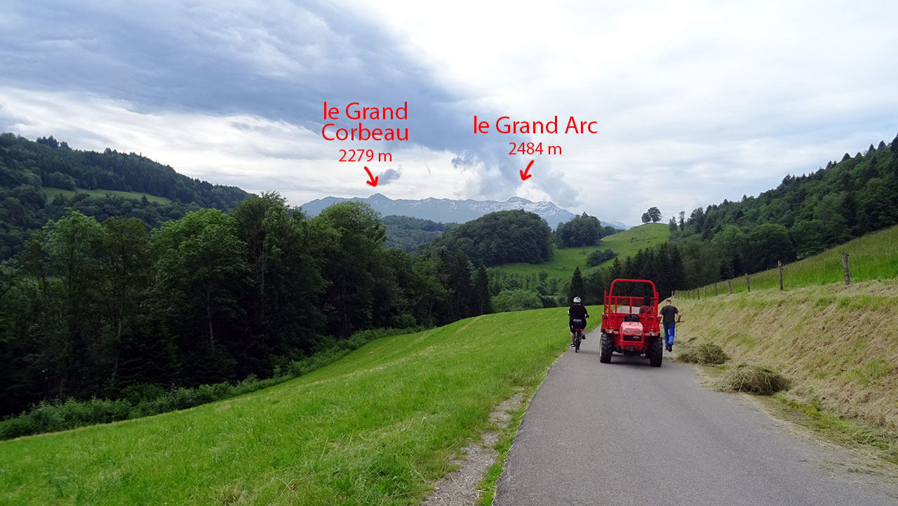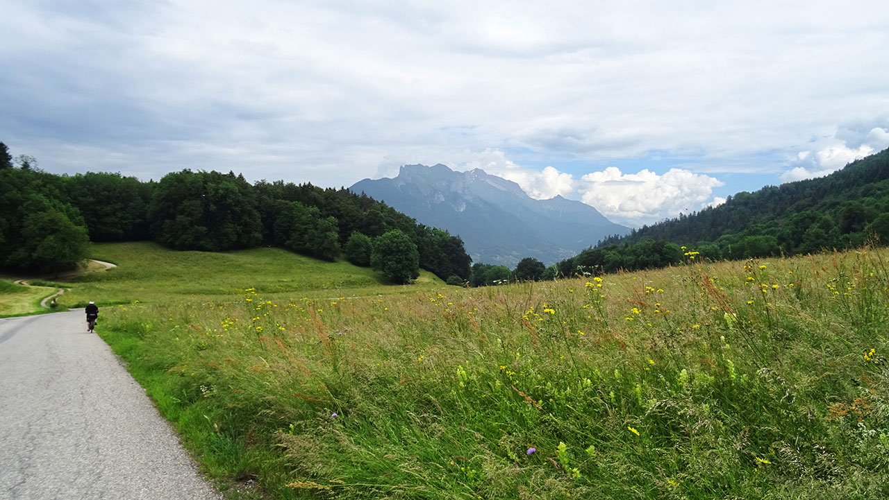 La première partie de l’ascension, longue de 3,6 km, sur une pente oscillant entre 4 et 6,5%, se déroule parfaitement. On profite du beau décor rural et montagnard à la fois qui nous est offert avec les sommets marquants des environs (Pointe de Chauriandre, Rocher d’Arclosan, la Tournette, la Belle Étoile, Pointe de la Samby) et le village de Seythenex perché sur une jolie colline.