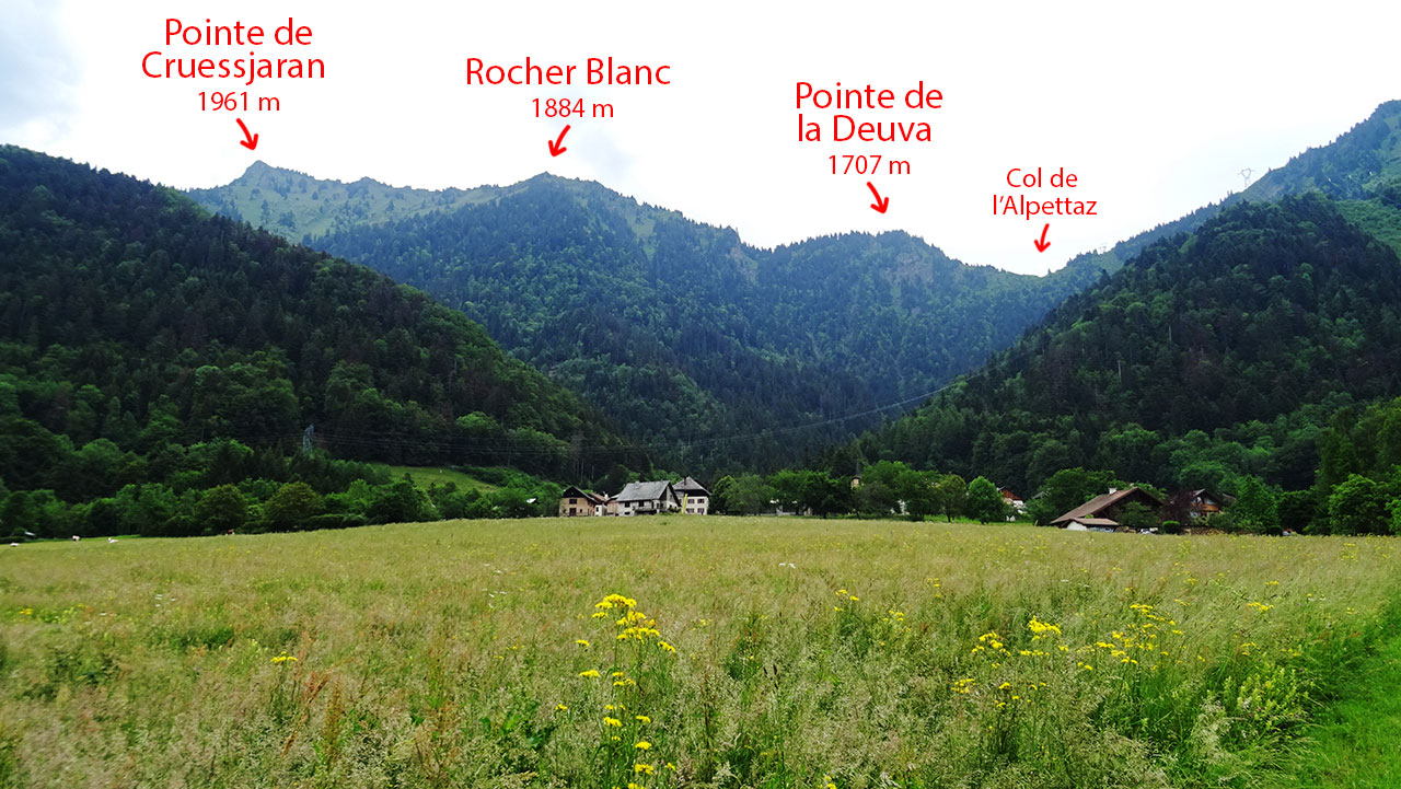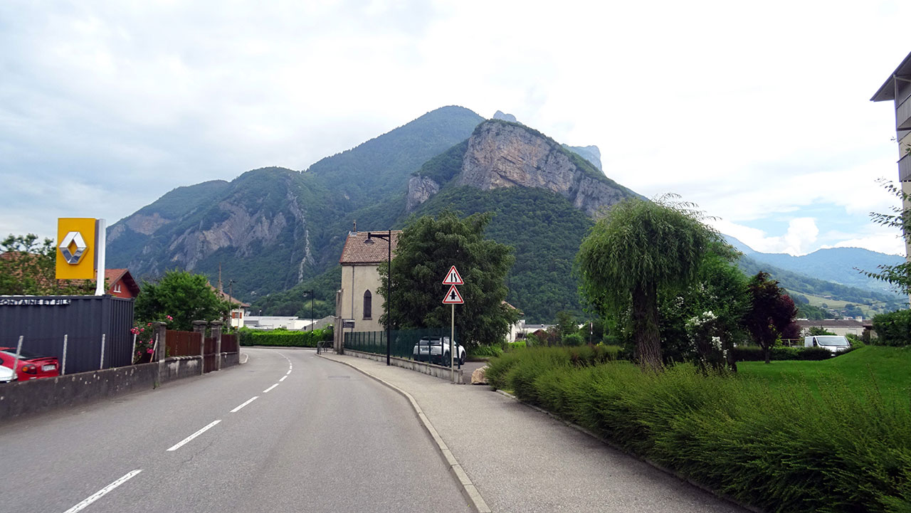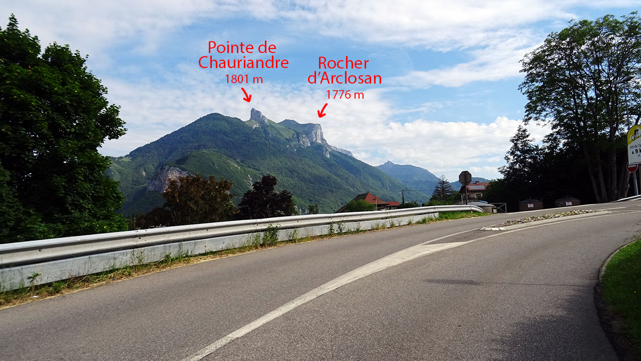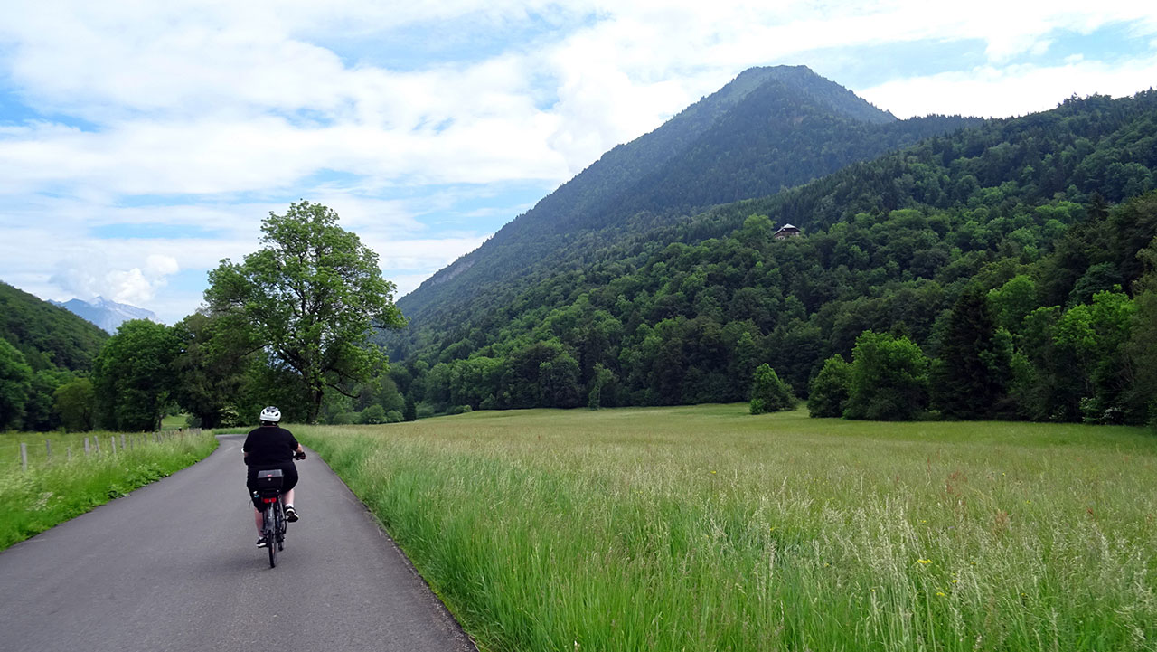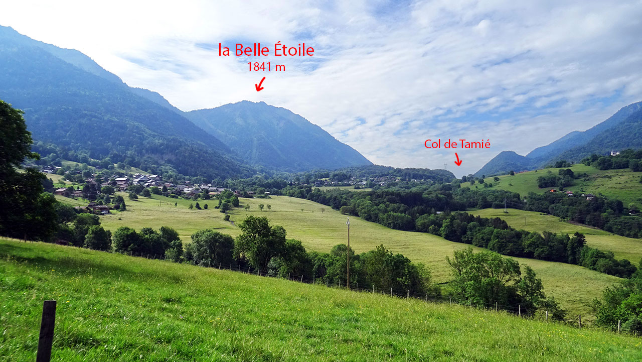 La première partie de l’ascension, longue de 3,6 km, sur une pente oscillant entre 4 et 6,5%, se déroule parfaitement. On profite du beau décor rural et montagnard à la fois qui nous est offert avec les sommets marquants des environs (Pointe de Chauriandre, Rocher d’Arclosan, la Tournette, la Belle Étoile, Pointe de la Samby) et le village de Seythenex perché sur une jolie colline.