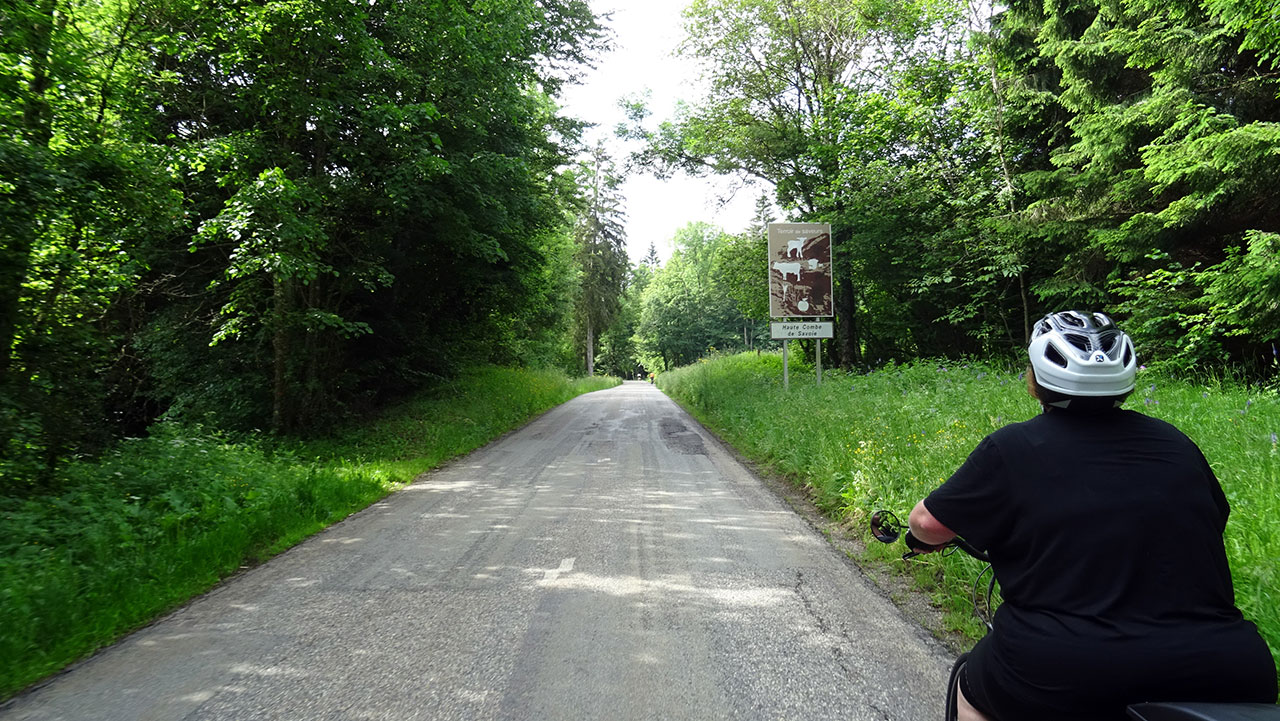Après le passage des Moulins de l’Abbaye de Tamié, nous attaquons la 3e et dernière partie du Col de Tamié. Rien de trop difficile avec 1350 m à 5% puis 300 m tout plat pour en terminer. On a connu pire comme ascension alpestre, même Corinne termine super bien ! Bravo à elle, elle a relevé haut la main le challenge et on peut dire que c’est son premier vrai col ! Pour ma part, j’aime bien ce col, il est très plaisant et tranquille. C’est mon second passage. J’aimerais bien le grimper un jour par l’un de ses autres versants du côté de la Combe de Savoie et ce sera une autre paire de manche…