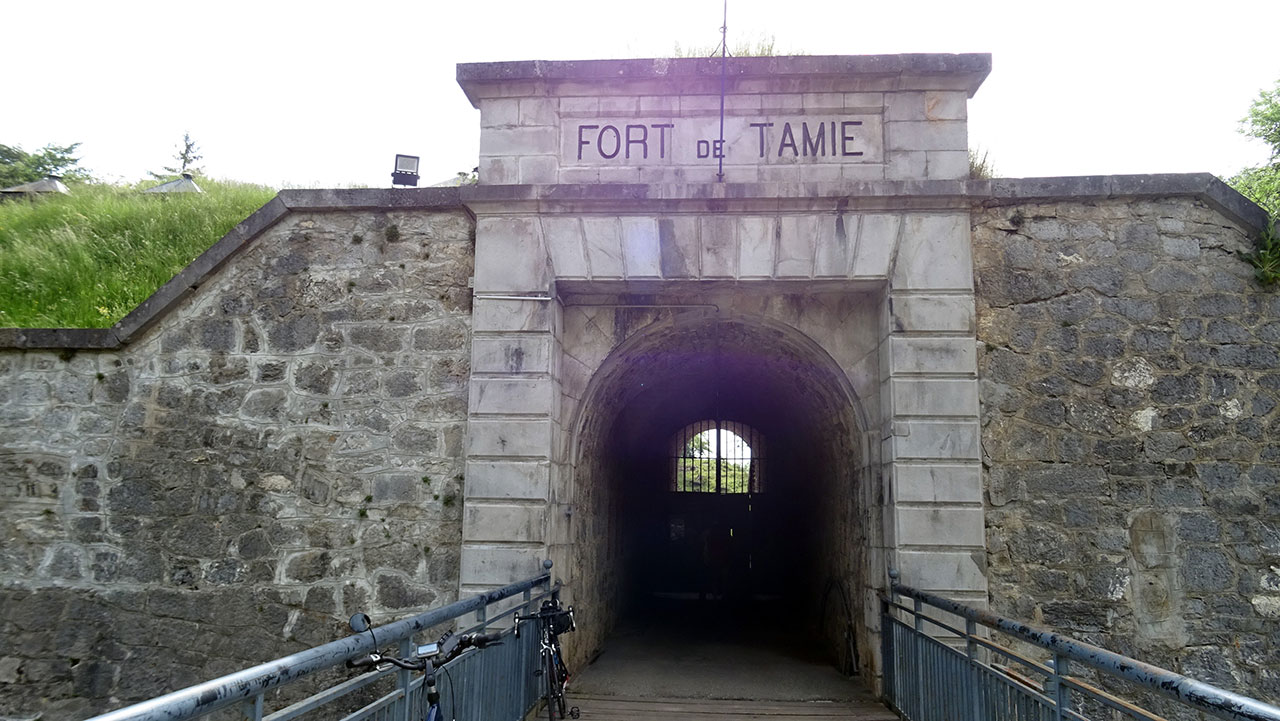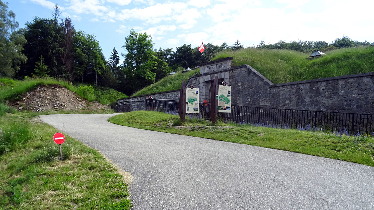 Comme Corinne se sent bien et qu’il lui reste pas mal de batterie, je lui propose de pousser un plus haut au Fort de Tamié. Je la préviens qu’il y a quand même une bonne petite rampe de 600 m à 8%. Pas de problème, là aussi, ça passe comme une lettre à la poste. Nous voilà quelques instants plus tard à l’entrée du Fort de Tamié à 972 m d’altitude.