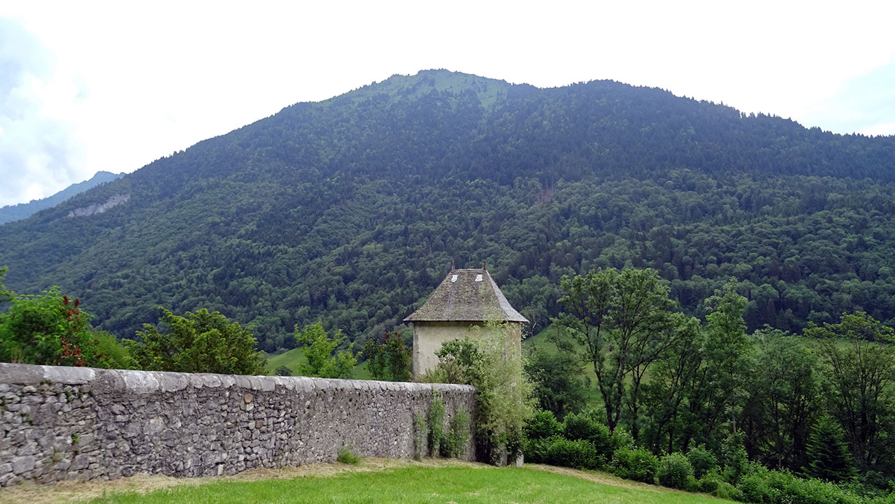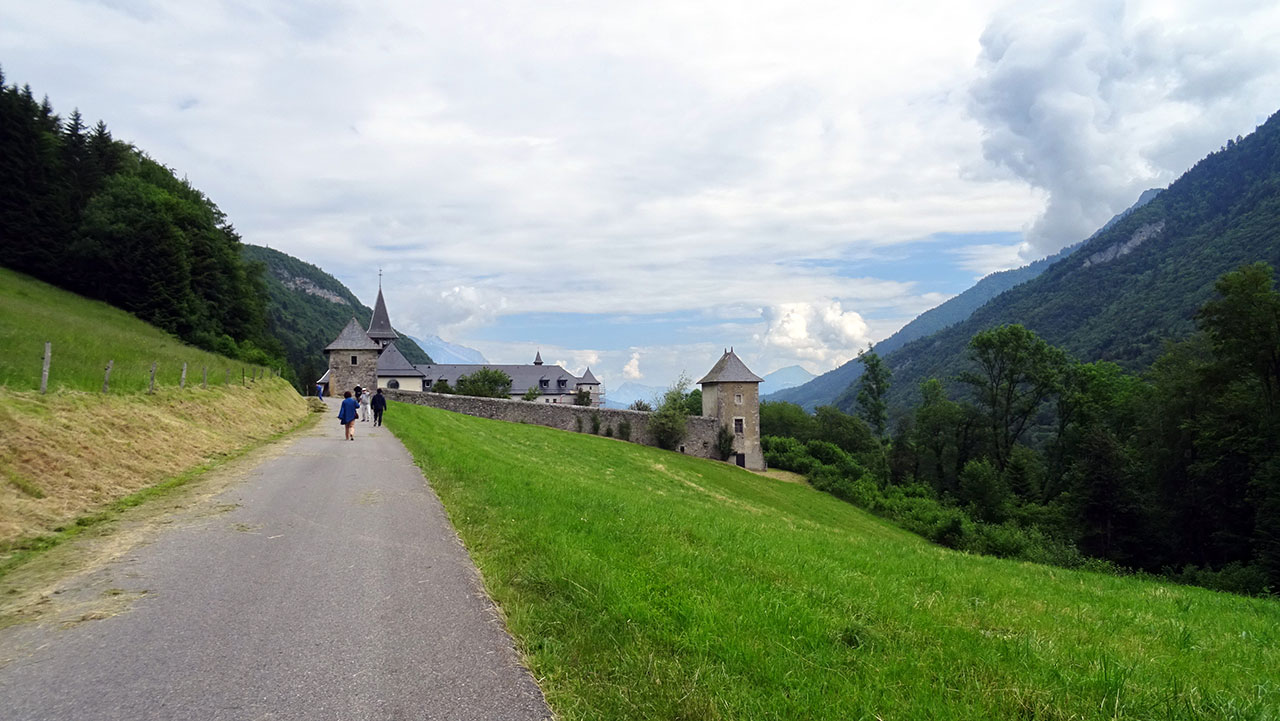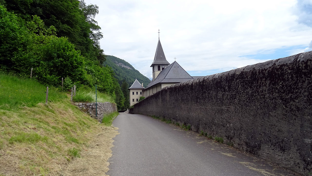 Tant que je suis assis sur la selle de mon vélo, mon lumbago ne me fait pas trop souffrir et comme il ne reste en théorie que de la descente et du plat, ça devrait le faire pour faire un petit détour en aller-retour à l’Abbaye de Tamié. Ce n’est pas très difficile avec un petit faux plat montant. Par contre, avec ses hauts murs qui entourent l’abbaye et qu’elle n’est pas visitable, il n’est pas facile de bien la voir. Le soleil commence à être caché par de gros nuages, la pluie n’est pas pour maintenant mais on ne va pas trop s’attarder.