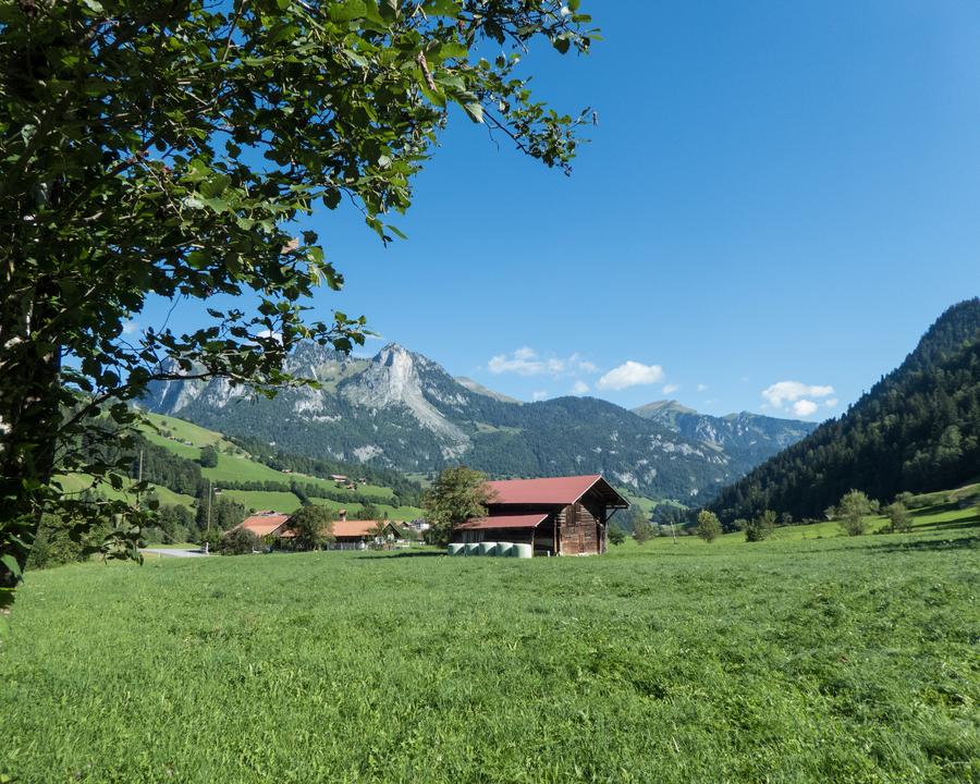 Durant 12 km, nous allons suivre tranquillement la Vallée de la Sarine sur la Route principale 11 jusqu’à Château d’Oex. Nous en profitons pour changer de Canton en passant de celui de Berne à celui de Vaud. La frontière géographique et surtout linguistique est ressentie de manière étonnante : dès Rougemont, situé 2 km après Saanen, tous les panneaux sont en… français ! Ouf, ça fait du bien de retrouver des trucs à lire dans ma langue natale ha ha ha !