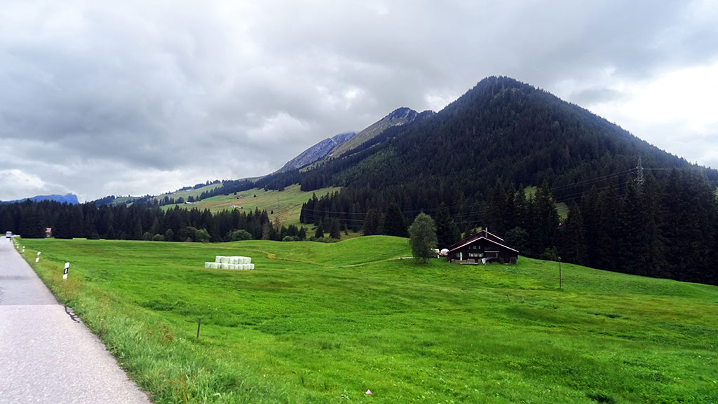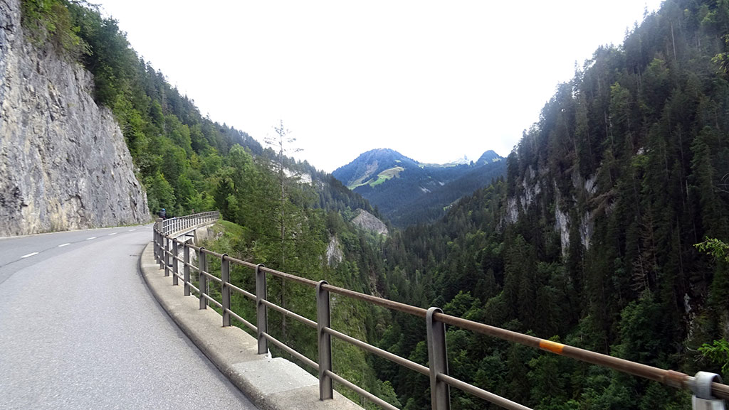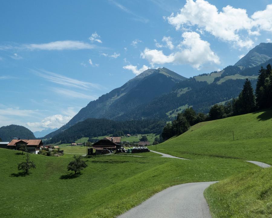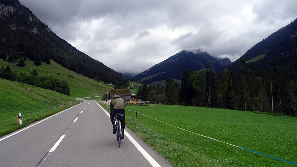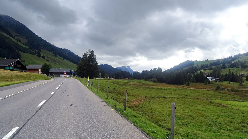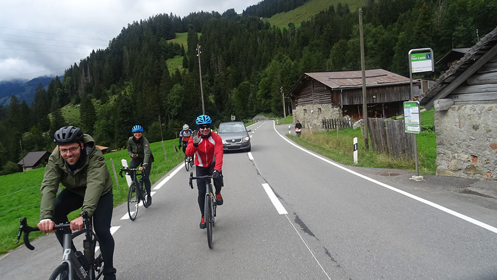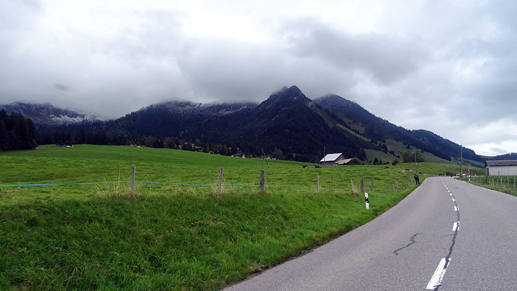 Après cette petite pause, on repart tous ensemble sur une route qui sera un très léger faux plat montant durant 4,1 km. C’est super agréable, on avance bien et on sort rapidement des gorges pour se retrouver dans un bel environnement constitué de fermes et de vastes pâturages. Nous sommes au cœur de l’Etivaz, un coin qui produit l’un des principaux fromages suisses du même nom. C’est que l’on est dans le « pays du fromage » car plus au Nord, il y a Gruyère par lequel on aurait dû passer si l’on avait emprunté le Jaunpass et au Col des Mosses que nous allons bientôt atteindre, il y a le Mont d’Or.