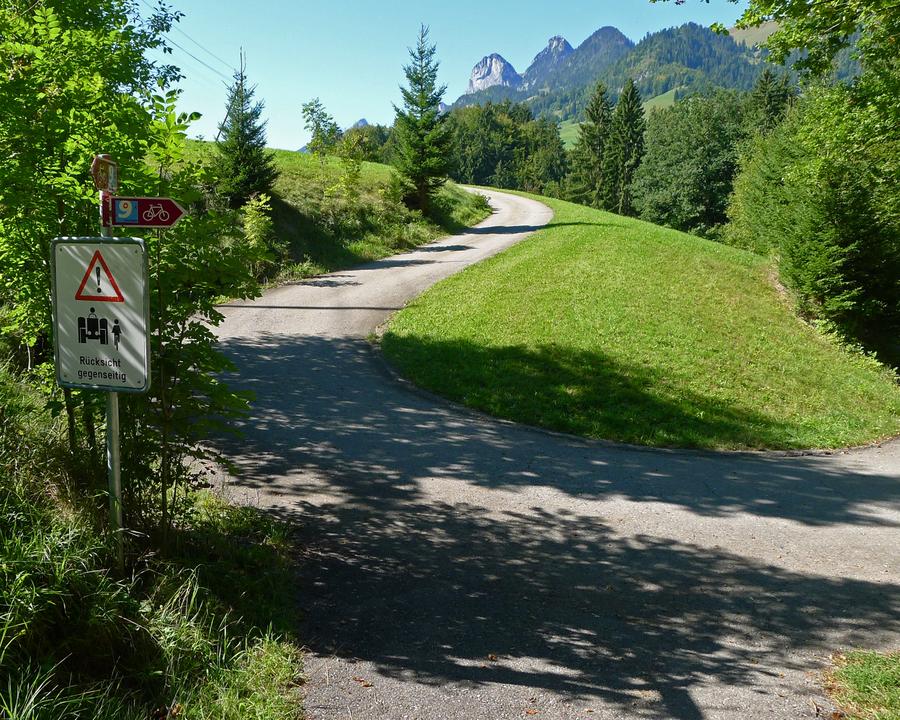 Nous arrivons à Wimmis qui marque l’entrée de la Vallée du Simmental (Niedersimmental). Nous allons la remonter durant près de 23 km jusqu’à Zweisimmen. Par contre, nous n’allons pas suivre la Route principale 11 mais une alternative beaucoup plus sympa : l’itinéraire cyclable nationale n°9 (défini comme l’étape n°3 de la Route des Lacs). Gros avantage, on va rouler au calme, avec quasiment aucune voiture, et, tout en traversant plusieurs la Simme, profiter d’un magnifique décor constitué de prairies luxuriantes où paissent tranquillement des vaches et de beaux chalets en bois, souvent décorés. Mais il faudra jouer souvent du dérailleur avec une succession de courtes montées et descentes et aussi avec des parties « gravel » !
