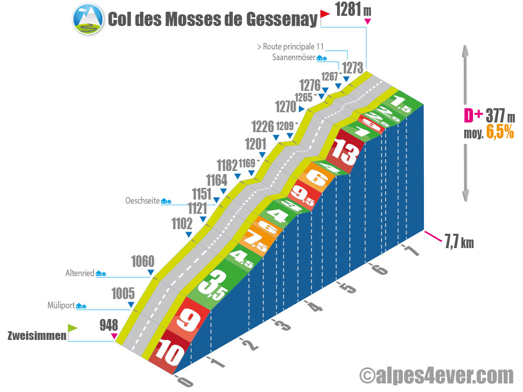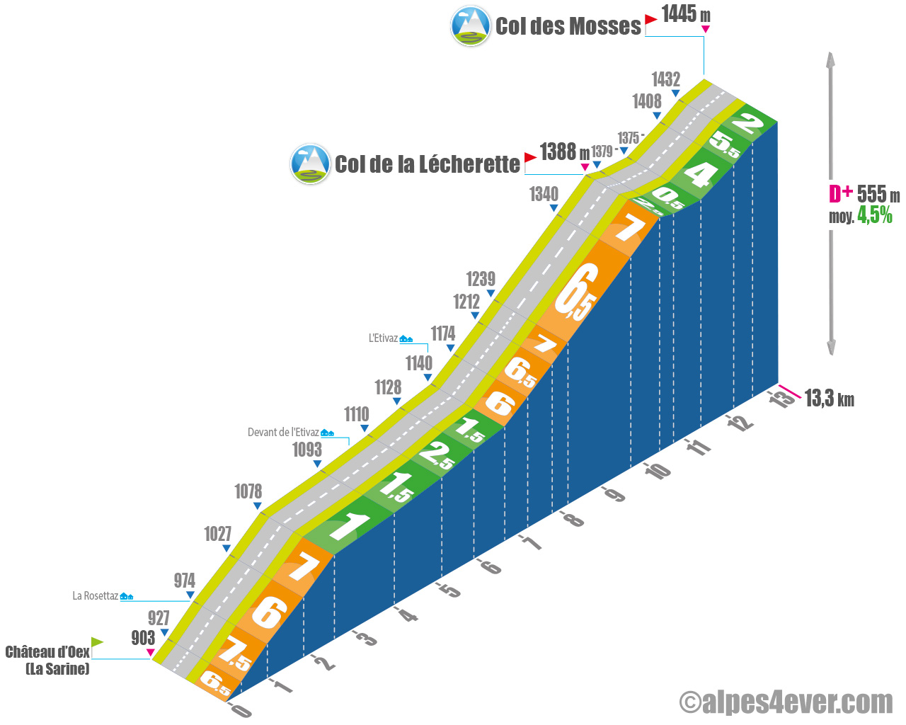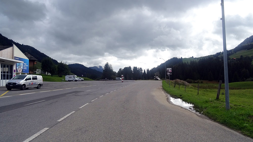 On traverse rapidement Château d’Oex qui est un joli bourg mais qui a la particularité de ne pas avoir de… château ! À sa sortie, on attaque l’ultime ascension de l’étape : le Col des Mosses. Situé à 1445 m d’altitude, son profil me plaît bien : pas trop long avec 13,3 km, les passages « difficiles » avec une pente oscillant entre 6 et 7% me conviendront parfaitement, il y a un bon replat intermédiaire pour se refaire une santé et enfin un final très facile.