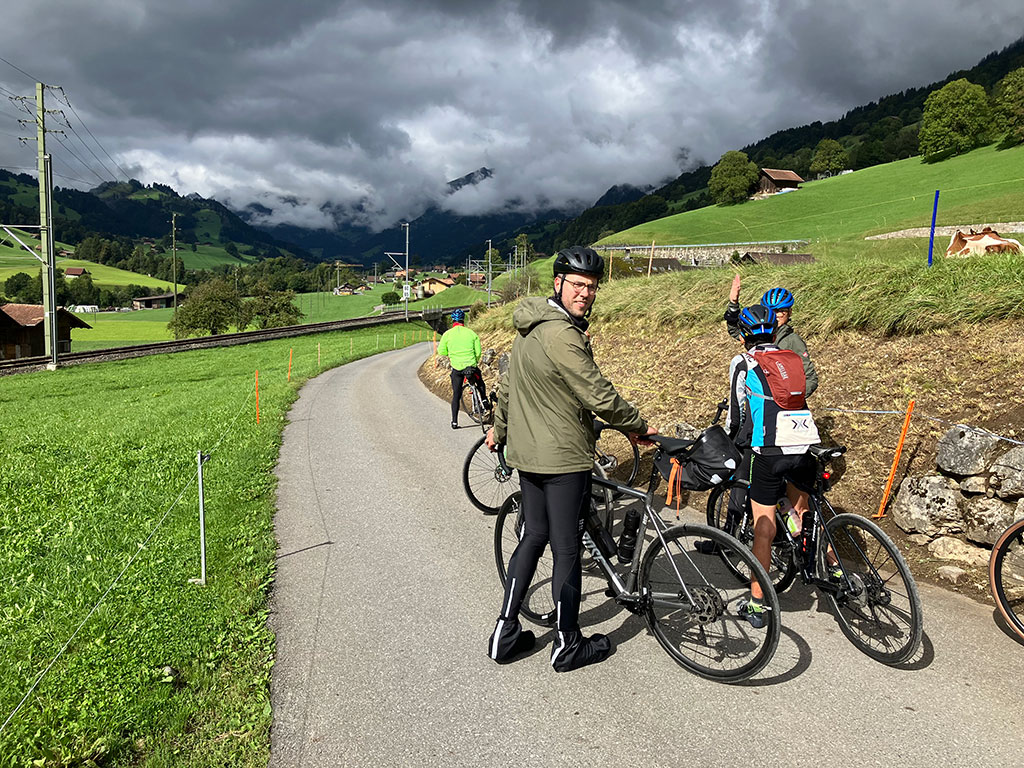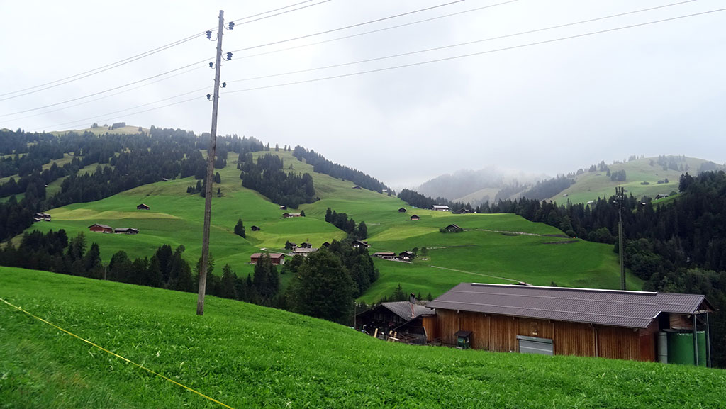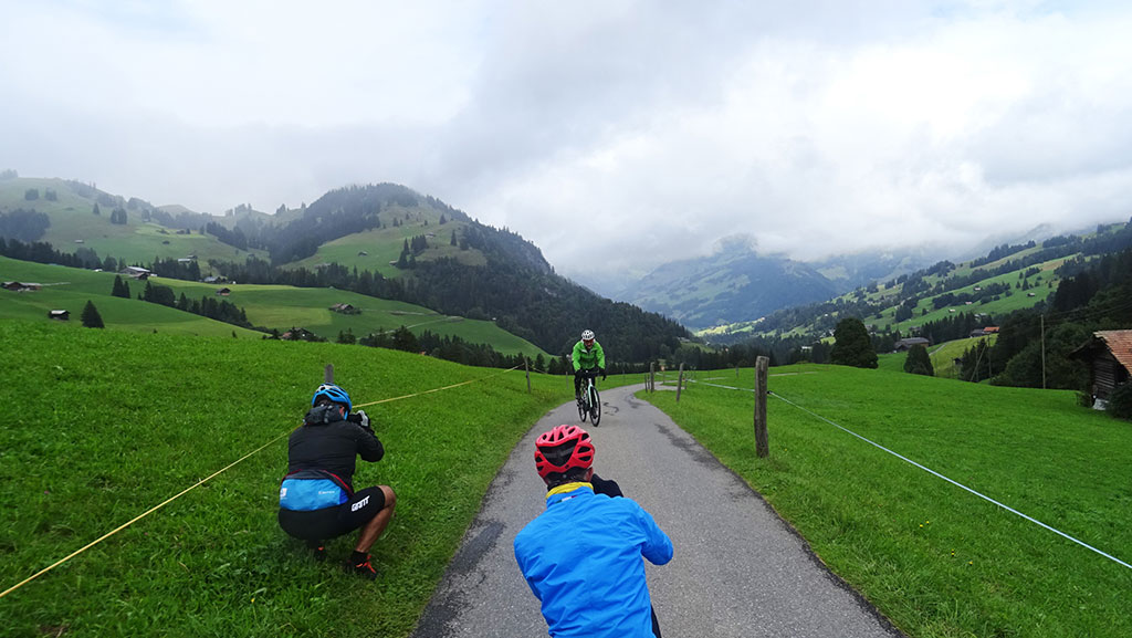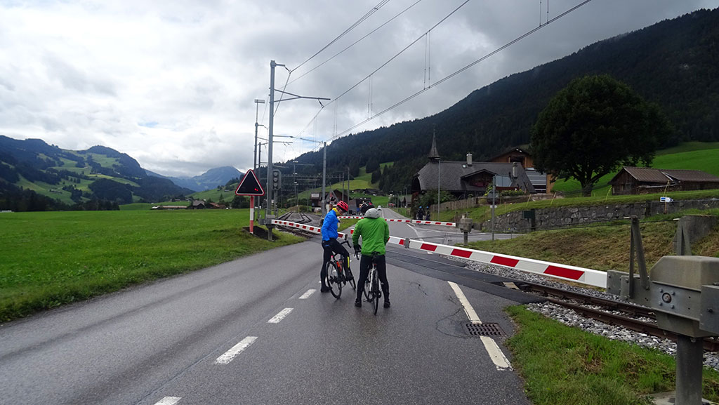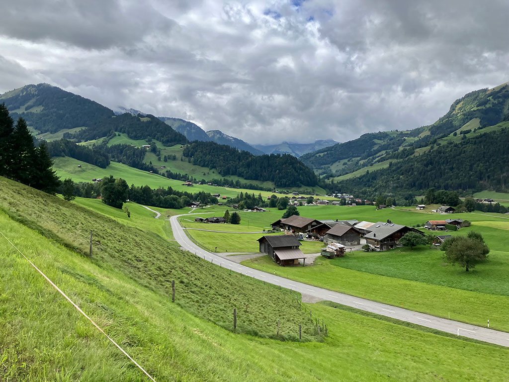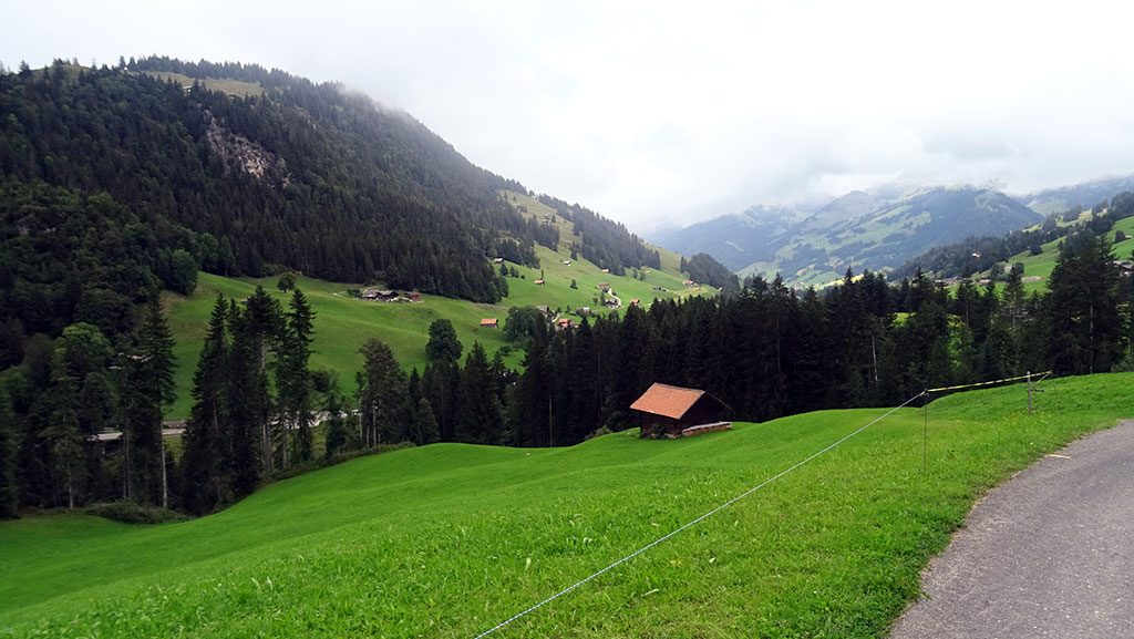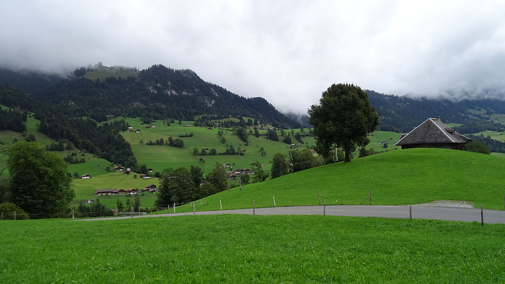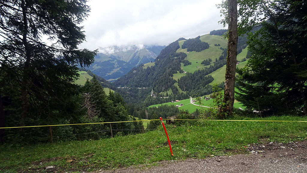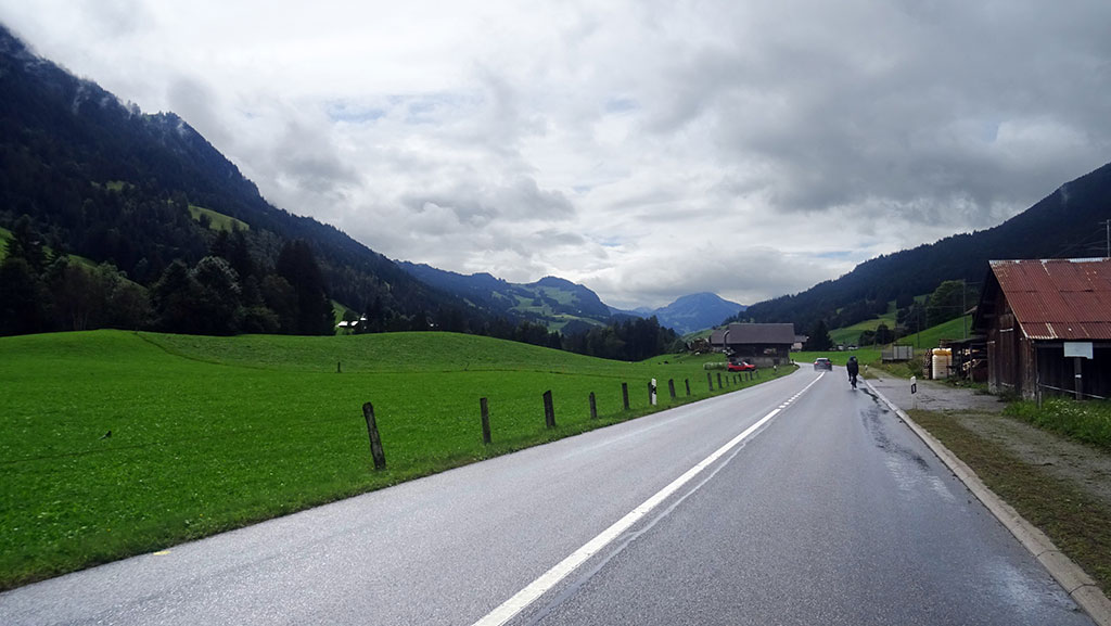 Nous repartons sous la pluie… qu’est-ce que je déteste cela ! Depuis que j’ai fait une chute à vélo il y a 2 ans en descente sur une route humide, j’en ai gardé une certaine appréhension. Du coup, dans la descente en direction de Saanen, je me fais rapidement distancer en jouant la prudence. J’aperçois Gstaad un peu au loin sur ma droite, le paysage semble magnifique mais le mauvais temps ne me donne pas le courage de prendre une photo. Ce sera encore une excuse pour revenir plus tard un jour découvrir cette région !