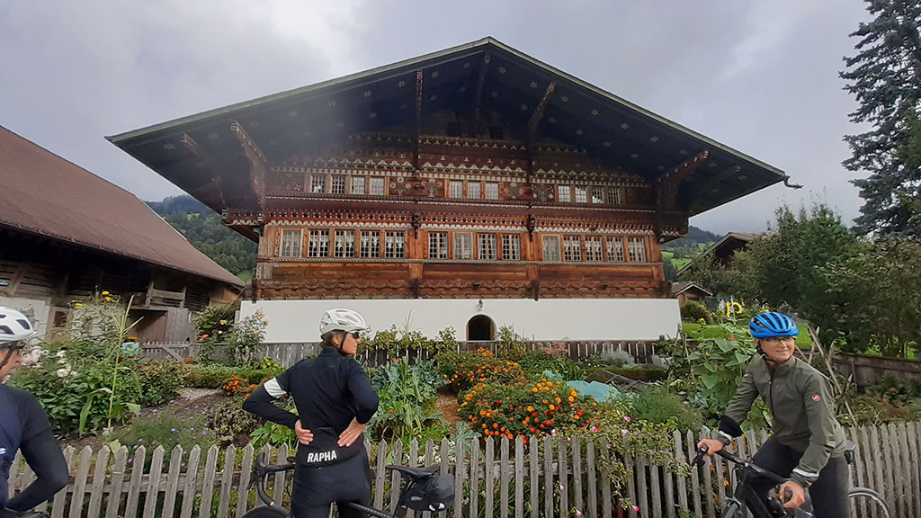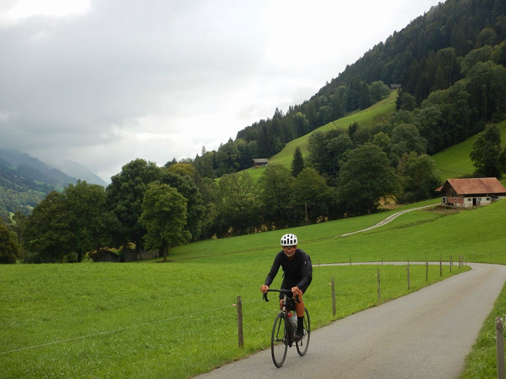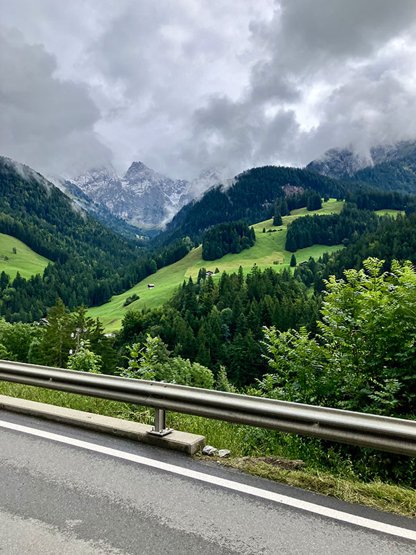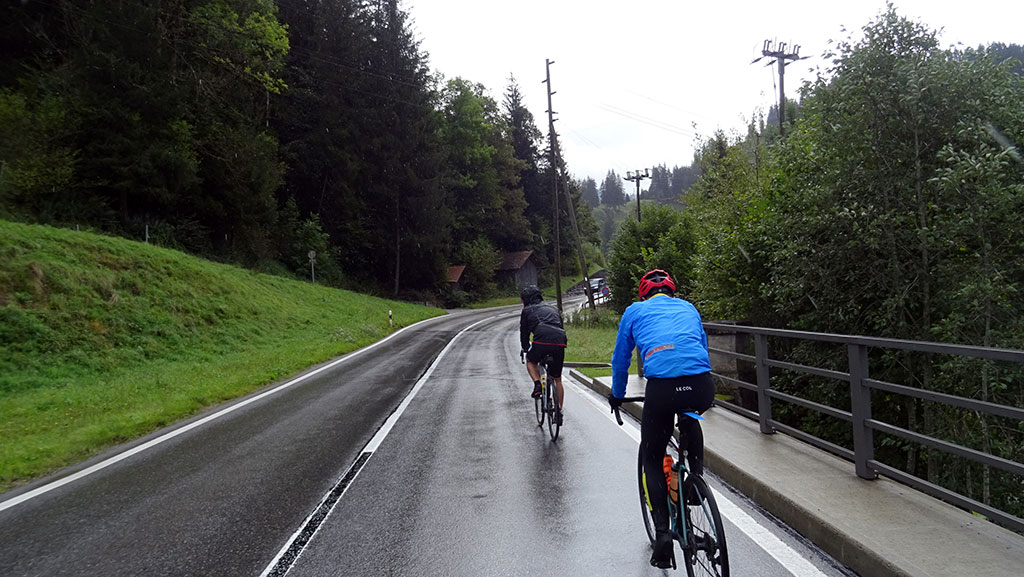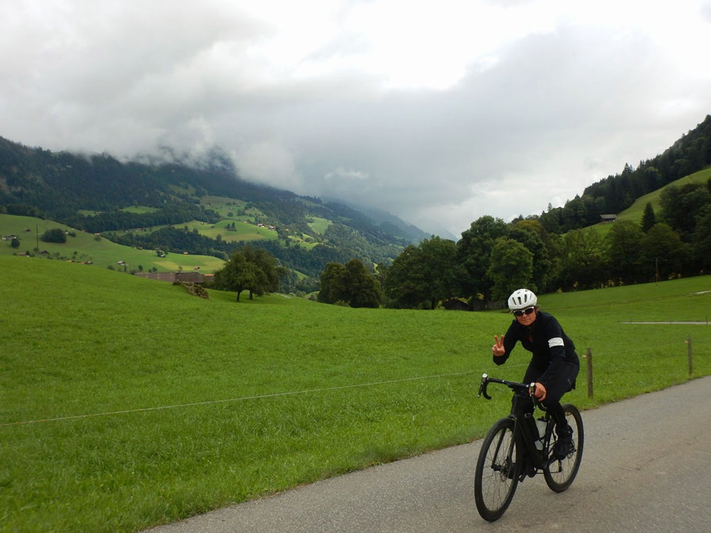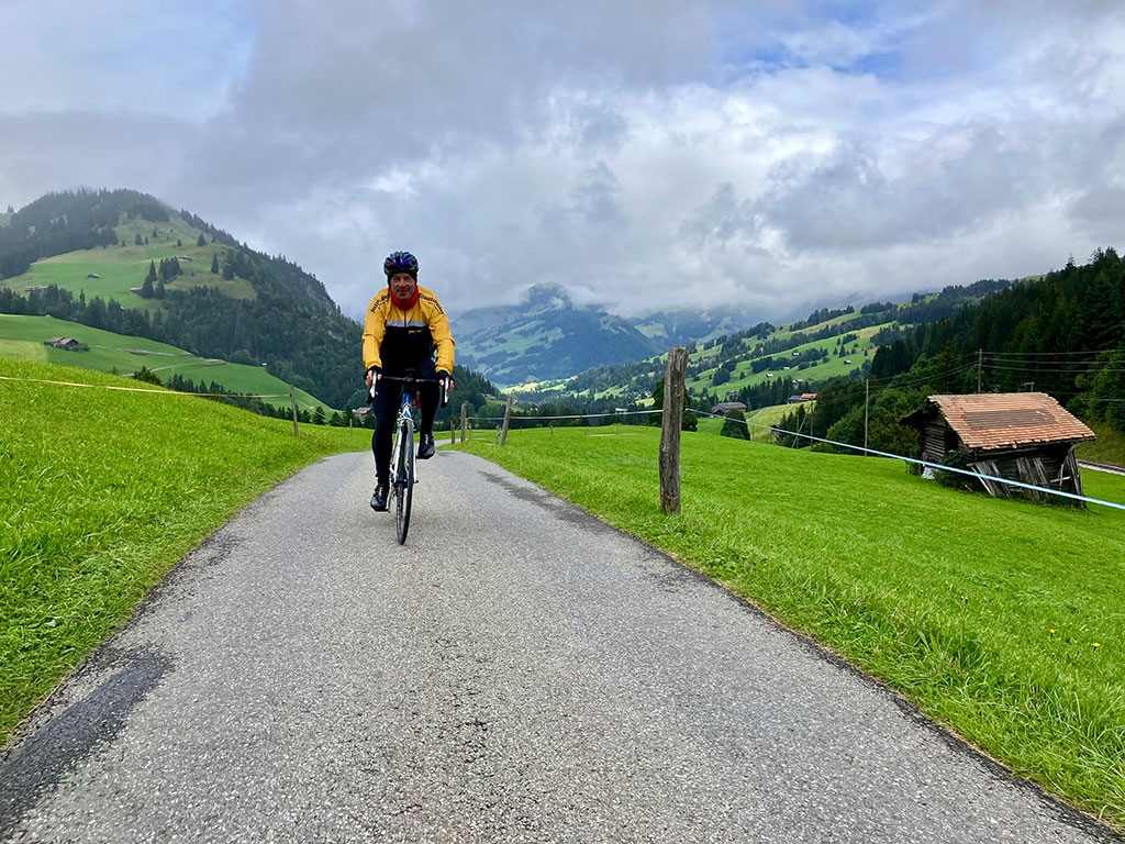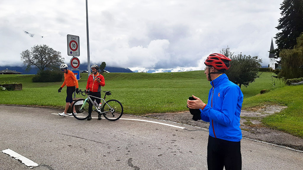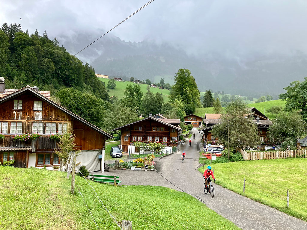 Nous repartons sous la pluie… qu’est-ce que je déteste cela ! Depuis que j’ai fait une chute à vélo il y a 2 ans en descente sur une route humide, j’en ai gardé une certaine appréhension. Du coup, dans la descente en direction de Saanen, je me fais rapidement distancer en jouant la prudence. J’aperçois Gstaad un peu au loin sur ma droite, le paysage semble magnifique mais le mauvais temps ne me donne pas le courage de prendre une photo. Ce sera encore une excuse pour revenir plus tard un jour découvrir cette région !