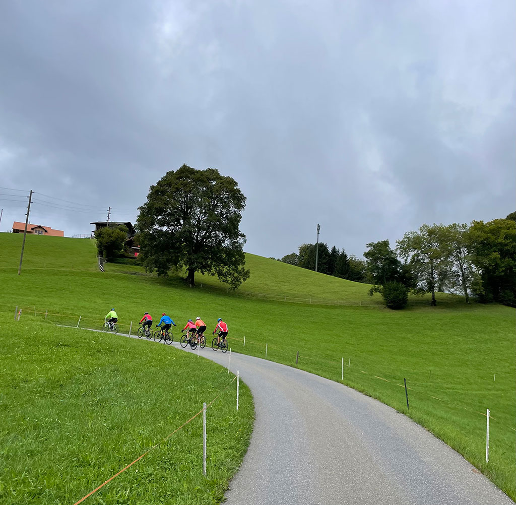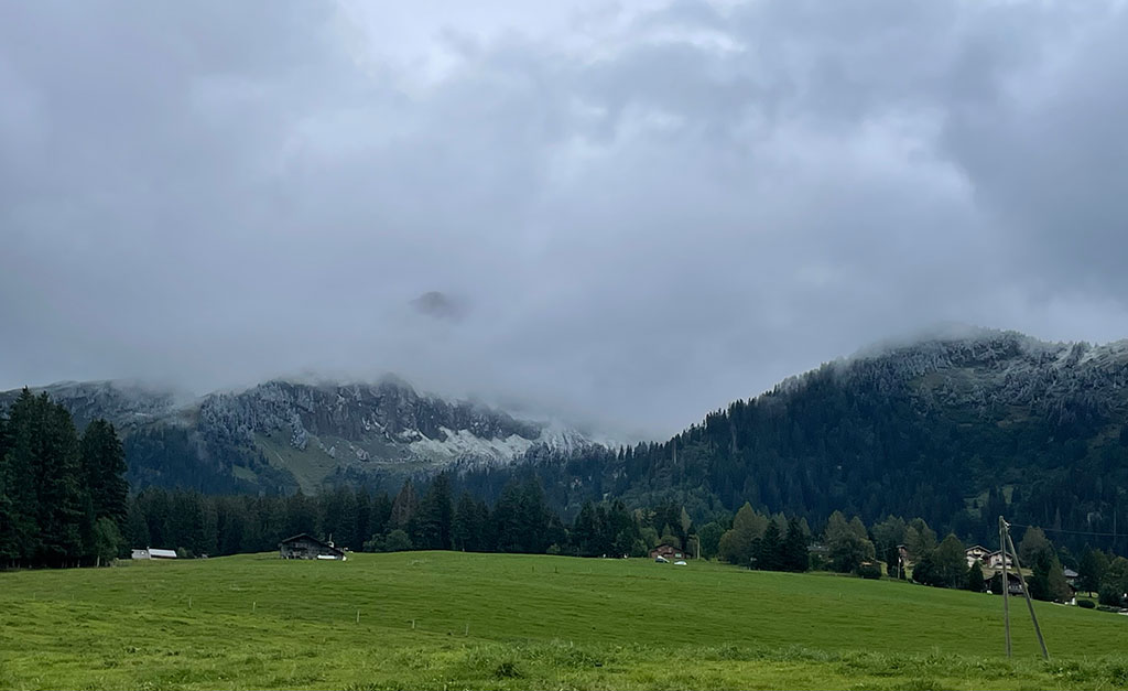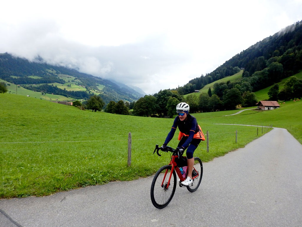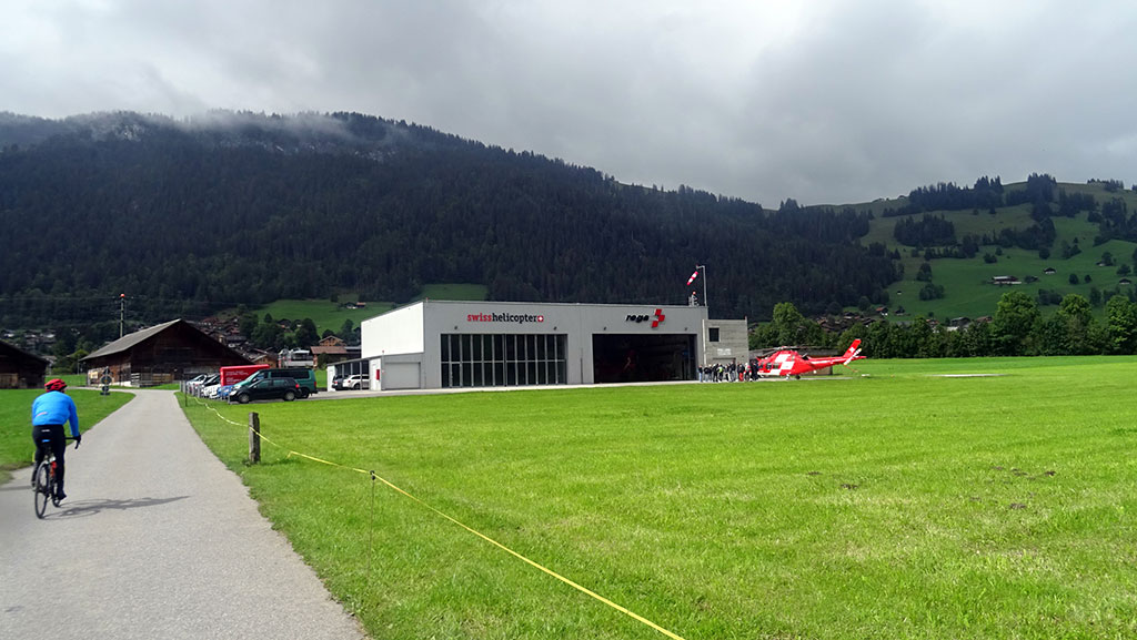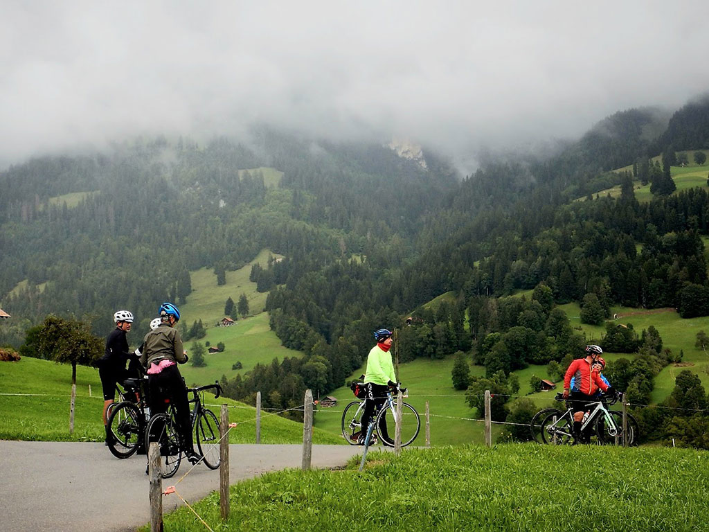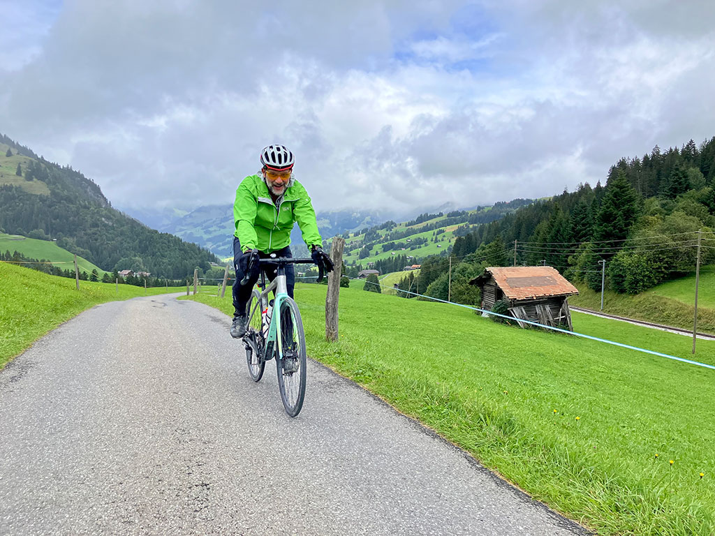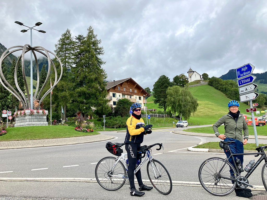 Nous repartons sous la pluie… qu’est-ce que je déteste cela ! Depuis que j’ai fait une chute à vélo il y a 2 ans en descente sur une route humide, j’en ai gardé une certaine appréhension. Du coup, dans la descente en direction de Saanen, je me fais rapidement distancer en jouant la prudence. J’aperçois Gstaad un peu au loin sur ma droite, le paysage semble magnifique mais le mauvais temps ne me donne pas le courage de prendre une photo. Ce sera encore une excuse pour revenir plus tard un jour découvrir cette région !