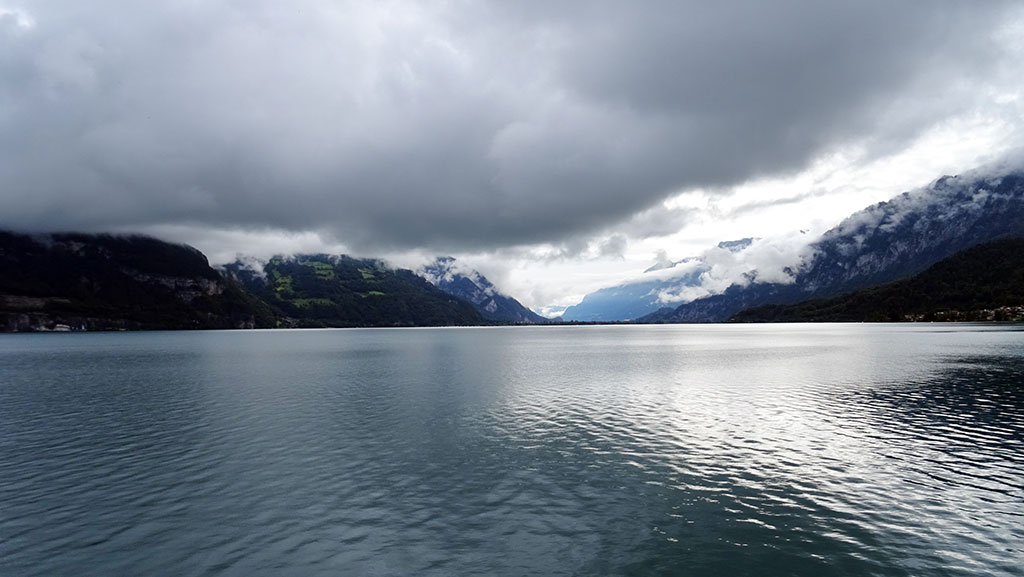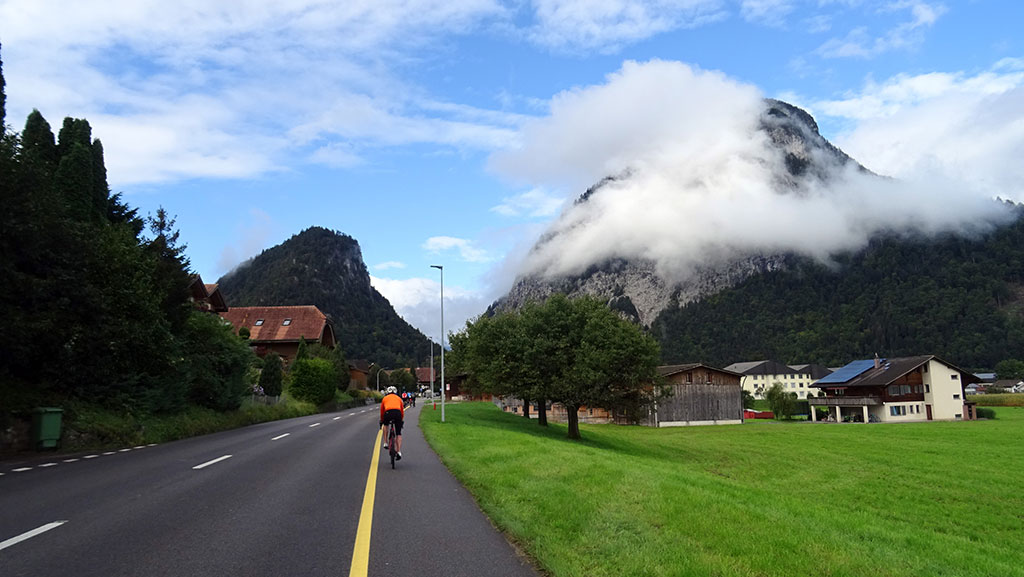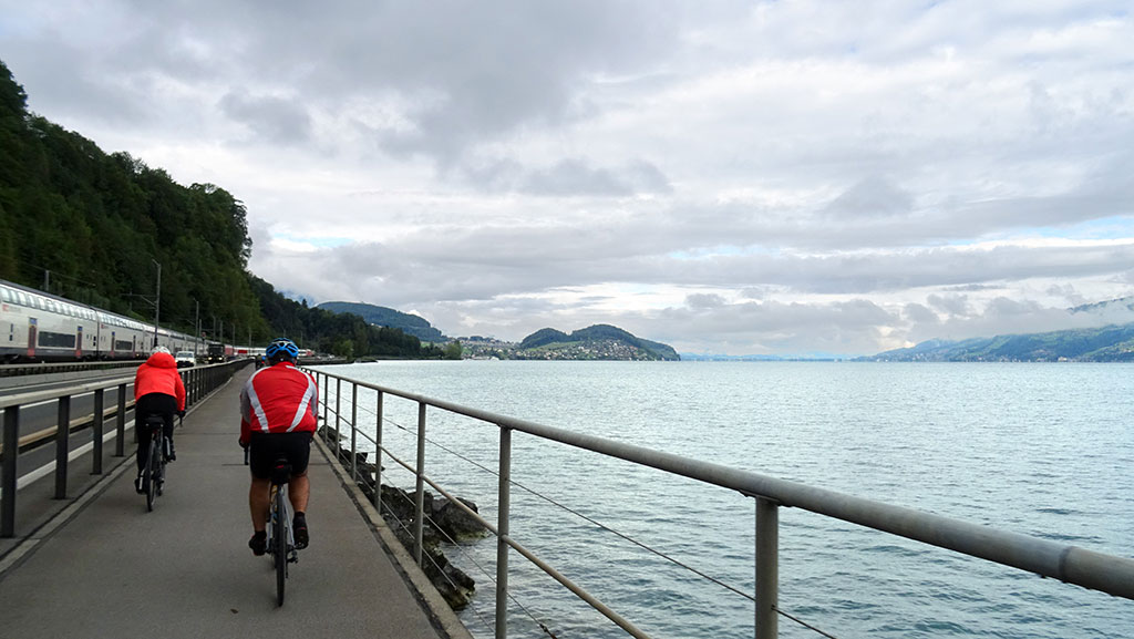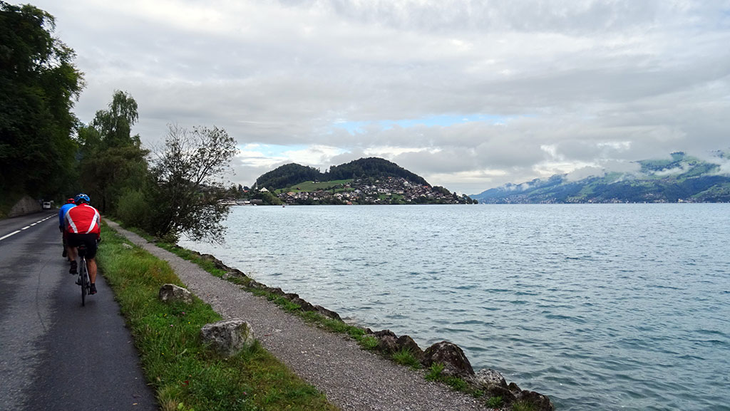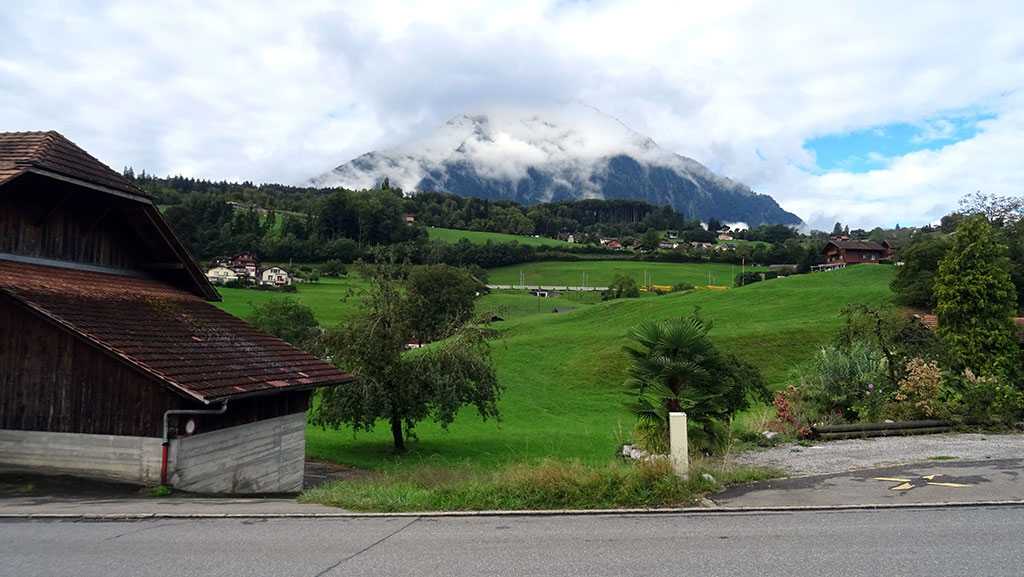 Nous quittons rapidement Interlaken (sans Batsirai donc, et Jenny, malade) et nous retrouvons sur les bords du Thunersee (Lac de Thoune). Durant 23 km, jusqu’à Wimmis, il n’y aura pratiquement aucune difficulté à part quelques courtes montées. Ça file vite, trop à mon goût, mais je décide de rester pour l’instant avec le groupe pour profiter de « l’effet peloton ». Je vais sacrifier quelques arrêts photos mais comme les nuages bas gâchent un peu le paysage, ce n’est pas trop grave… me promettant de revenir un jour faire un séjour pour mieux profiter de la région.