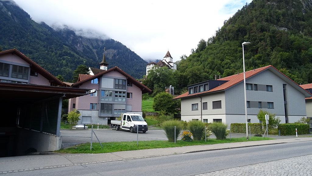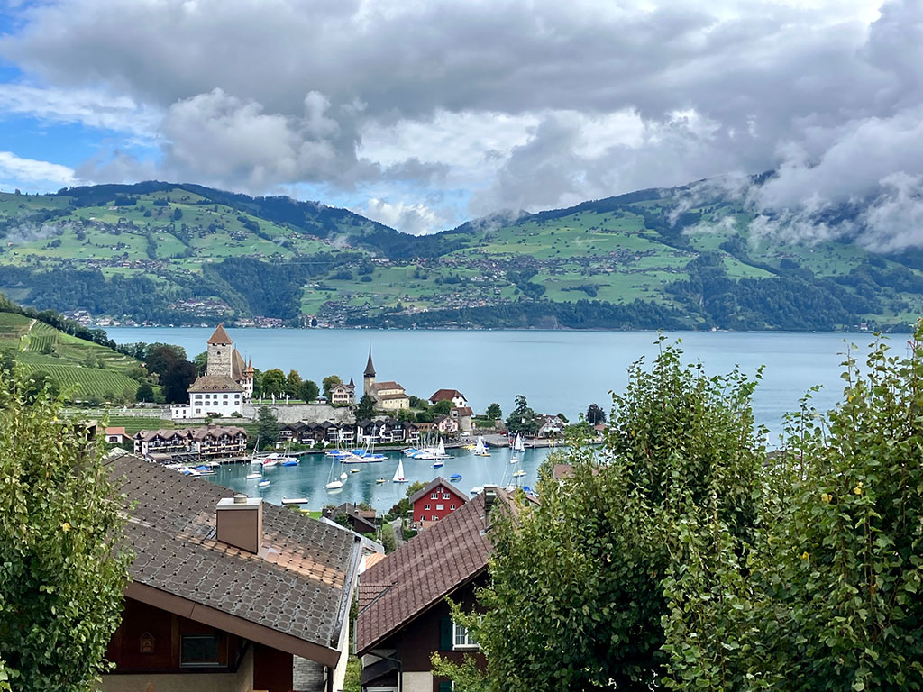 À l’entrée de Spiez, un joli village situé à cheval sur 2 petits monts sur les bords du Thunersee, on fait une pause pour essayer de régler un problème : le dérailleur électrique du vélo de Patricia ne fonctionne plus très bien. Pas facile de réparer ce problème plus électrique que mécanique… Patricia devra se passer des 2 plus petites vitesses, ça ira pour l’instant car les pentes ne seront pas trop fortes pour cette étape.