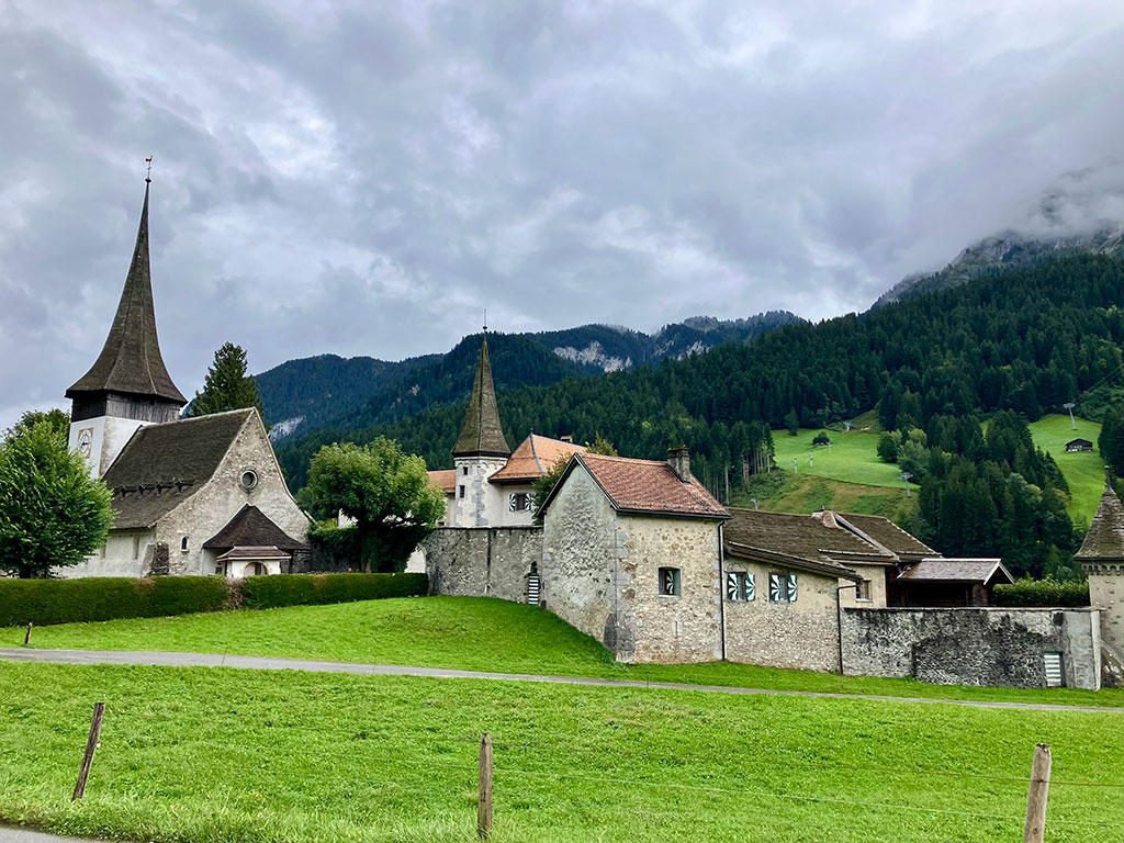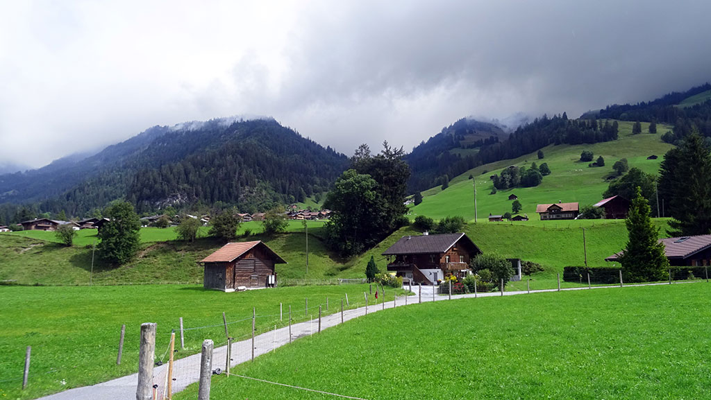 Deux bonnes nouvelles m’accueillent au bas de Saanen où se termine la descente : regroupement pour récupérer le retardataire que j’étais et surtout fin de l’averse… le ciel est toujours nuageux mais plus clair, donnant l’idée que la pluie allait faire une bonne pause pour cet après-midi. Cela me remet du baume au cœur ! Mais on reste tout habillé en mode hiver car il ne fait pas bien chaud.