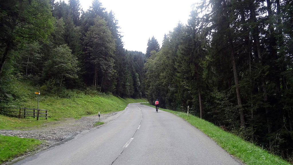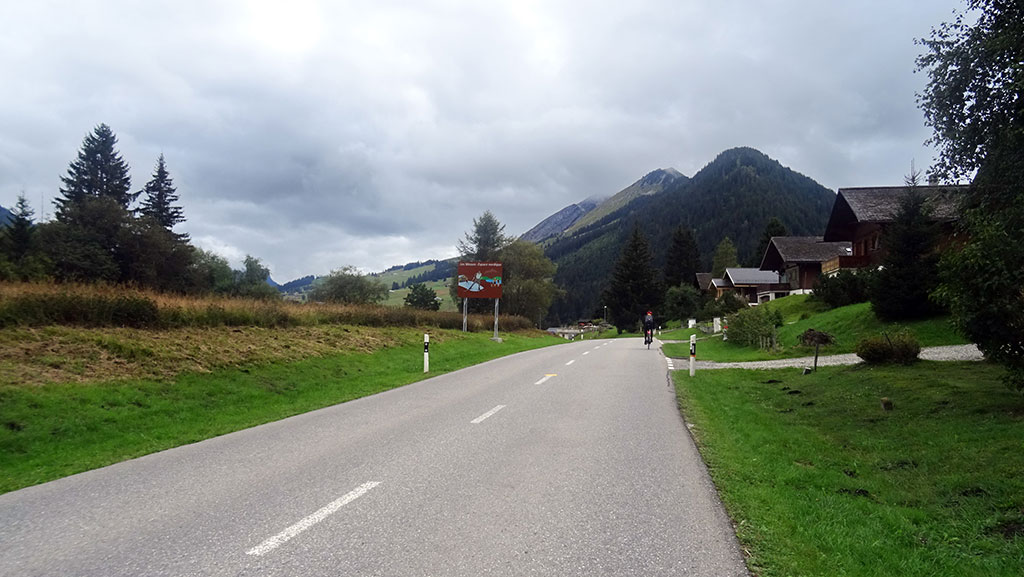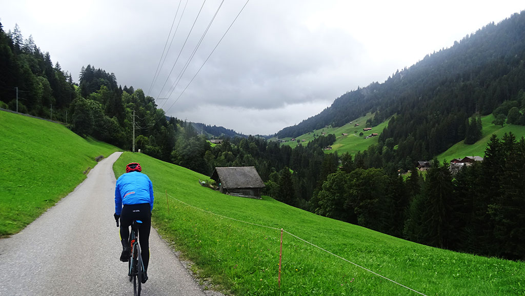 Nous arrivons peu après à Zweisimmen et allons attaqué désormais la montée effective du Col des Mosses de Gessenay (1281 m) toujours sur le tracé cyclable n°9. Elle n’est pas très longue avec ses 7,7 km mais elle est très irrégulière et propose des passages assez raides dont l’Äbeni Weid – 1270 m, avec 470 m à 13% donc un passage final à près de 18% ! Par contre, plus de passage gravel, la route sera entièrement asphaltée. Nous changeons à cette occasion de vallée qui sera celle de la Petite Simme. Nous terminerons malheureusement cette ascension sous la pluie…