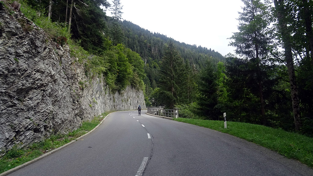 À l’issue du replat, la route traverse la Torneresse à proximité d’Etivaz et part à l’assaut du second passage difficile de l’ascension. On est à nouveau en forêt et ce sera 3,7 km à 6/7% de moyenne. Le groupe éclate à nouveau, je pars aux avants postes en compagnie de Georges. Ce dernier appuie fort sur les pédales, ma barre de vie commence un peu à être entamée… je relâche mon effort car j’ai envie de terminer tranquillement… j’ai comme une appréhension que ça va être la dernière montée du séjour…