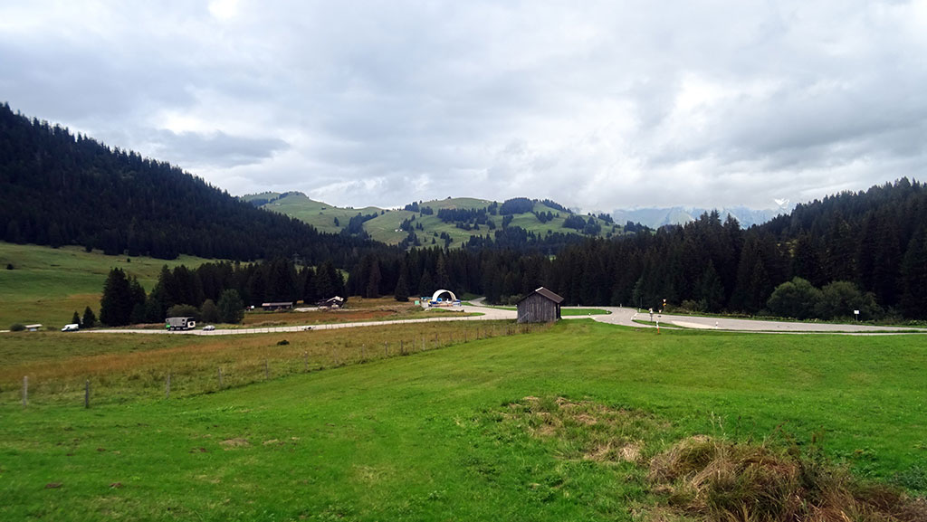 On en termine avec les difficultés en rejoignant la Route principale 11 à Saanenmöser. Peu après, nous franchissons le Col des Mosses de Gessenay à 1281 m d’altitude… sans nous en rendre vraiment compte car il n’y a pas de panneau et aussi la faute à une pluie glaciale qui ne nous donnait qu’une envie : trouver rapidement le ravito qui se trouvait non loin à Schönried.