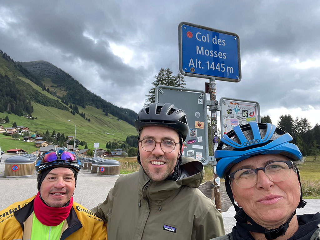 Je trainaille, profite de l’instant présent et de ce coin apaisant. Esther, Jeremiah et Mansour m’ont rattrapé. Quelques instants plus tard, me voilà au Col des Mosses à 1445 m d’altitude. Photo souvenir au panneau du col en compagnie d’Esther et Jeremiah. L’étape a été raccourcie avec 96 km mais malgré le Jaunpass en moins, le D+ a été assez conséquent avec pratiquement 1900 m !