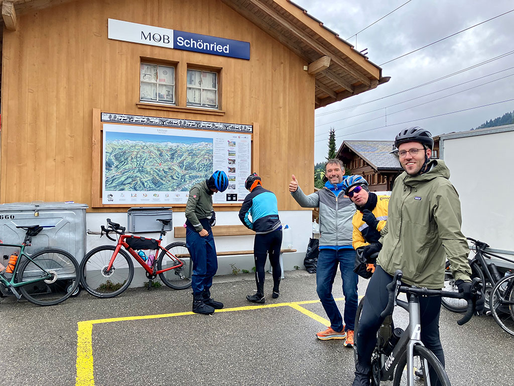 On débusque le coin ravito proposé par notre guide Stéphan : la gare de Schönried. Pratique car il y a un auvent pour s’abriter de la pluie et surtout un café pour pouvoir se commander une boisson chaude. Bon, je n’ose pas vous annoncer ce que m’a coûté un café macchiato, c’est que l’on est à 2 pas de Gstaad, station et lieu de villégiature huppé fréquentés par l’élite internationale du monde des affaires et du spectacle ! Notre Johnny Halliday national y avait d’ailleurs ses quartiers.
