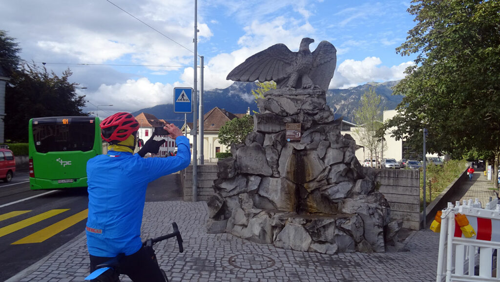 Comme je connaissais un peu les lieux après mon petit séjour que j’avais fait au mois de juin dernier, je guide le groupe vers la gare. Sans m’en rendre compte, on perd Peter mais il a eu le bon esprit d’aller faire un petit détour vers la mairie pour prendre une photo symbolique au départ de la Route des Grandes Alpes ! Sur le coup, j’ai un peu regretté de ne pas avoir eu la même idée… Étant modestement l’initiateur de alpes4ever.com, j’ai manqué le coup ! Bon, à ma décharge, j’ai eu l’impression de ne pas avoir eu les idées très claires depuis le début de cette journée avec ma déception de terminer la Traversée des Alpes suisses sur une très mauvaise note…