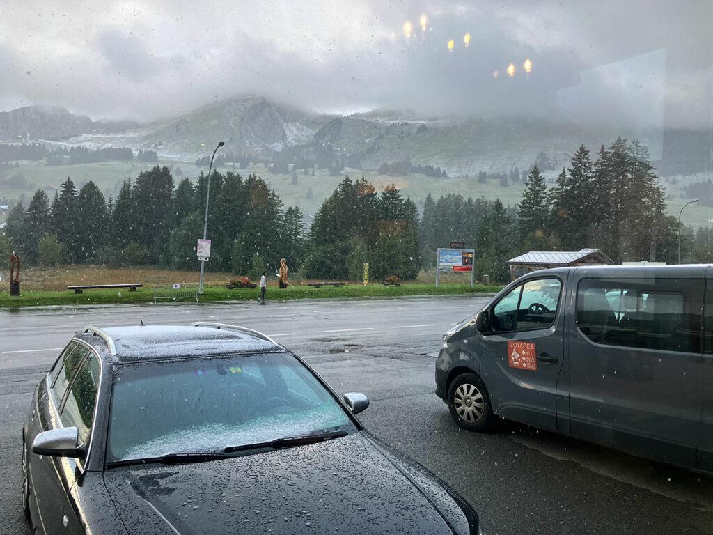 Je savais aussi que les prévisions météo consultées la veille au soir avant de se coucher n’étaient pas des plus optimistes pour ce matin… Mais alors pas du tout… La première chose que je fais en me levant est d’aller ouvrir les rideaux pour voir le temps qu’il faisait… Argh ! Il neige !!!!! Un 13 septembre !!!!! Vous y croyez ça ?!