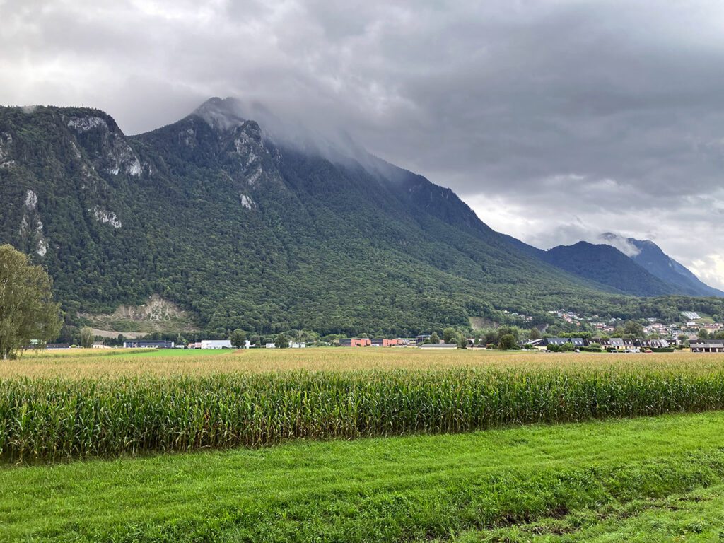 On rejoint le Rhône pour emprunter l’Eurovélo 17. Nous le suivons en file indienne sur sa rive gauche. Un vent de face puis une grosse rabasse nous tombe dessus. Décidément, quelle journée de m… Agustin et Peter ouvrent la voie avec force, je reste sagement en 5e position pour m’abriter des intempéries et je veille surtout à ne pas décrocher ! Heureusement, il ne fait plus aussi froid qu’au Col des Mosses. Je vous jure, un 13 septembre !