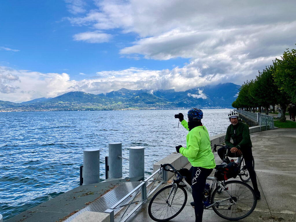 Il me reste un dernier baroud d’honneur à accomplir en ralliant Thonon-les-Bains depuis Aigle (47 km) via les rives du Lac Léman. Et ce sera en compagnie des derniers « courageux » : Peter, George, Walter et Agustin. On oublie tout de suite l’option Pas de Morgins car l’éclaircie a brusquement disparu et un gros nuage noir fonce droit sur nous… On va se prendre quelques instants plus tard une bonne saucée !