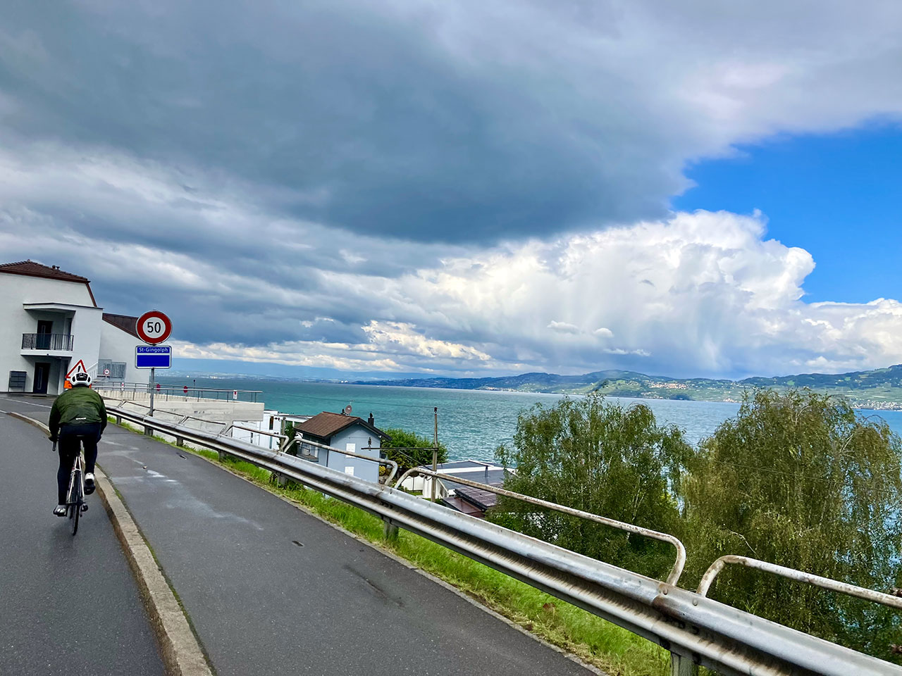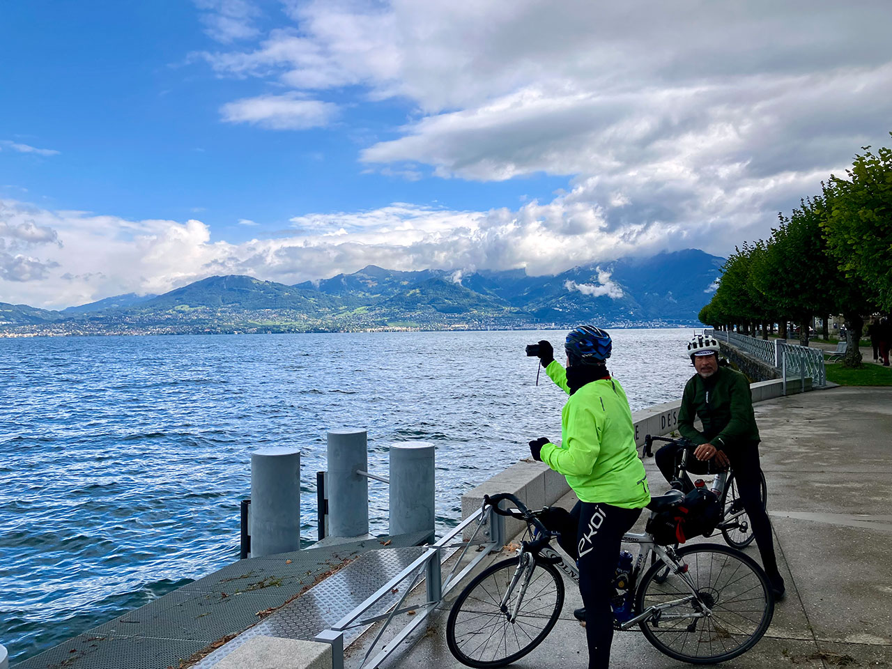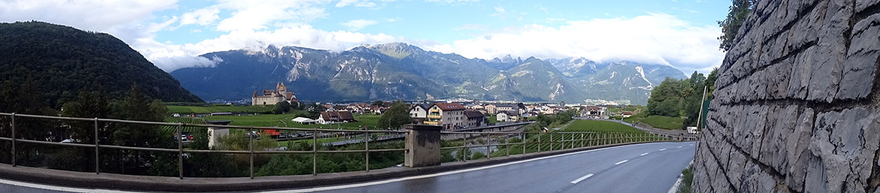 Il me reste un dernier baroud d’honneur à accomplir en ralliant Thonon-les-Bains depuis Aigle (47 km) via les rives du Lac Léman. Et ce sera en compagnie des derniers « courageux » : Peter, George, Walter et Agustin. On oublie tout de suite l’option Pas de Morgins car l’éclaircie a brusquement disparu et un gros nuage noir fonce droit sur nous… On va se prendre quelques instants plus tard une bonne saucée !