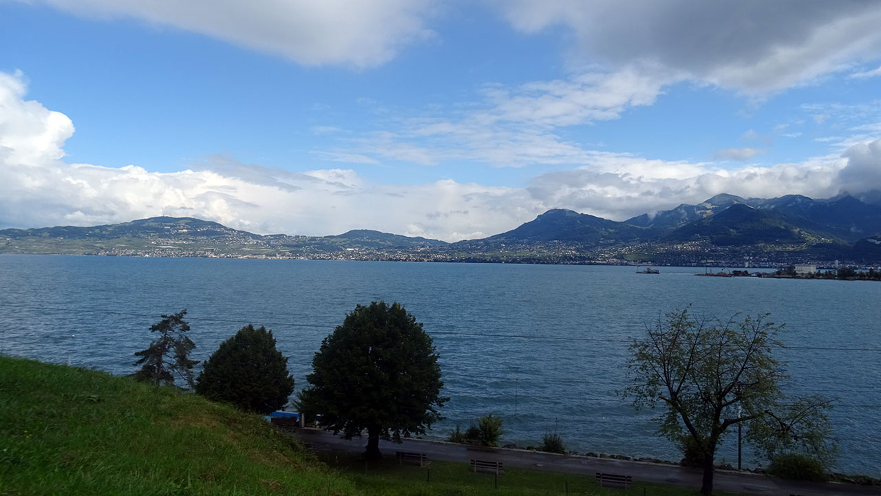 Il s’est arrêté de pleuvoir. On fait une petite pause à St-Gingolph pour admirer le Lac Léman. Paradoxalement, il y a quelques coins de ciels bleus mais ils disparaissent assez vite au profit de belles averses qui tombent un peu partout sur et autour du lac.