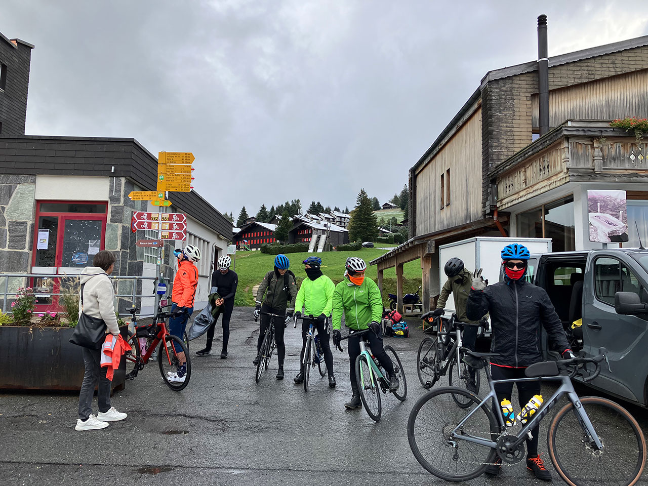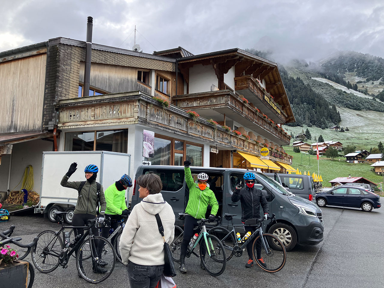 Mais il fallut patienter que tout le monde soit prêt et c’est seulement à 9h30 qu’on a pu s’élancer pour la dernière étape du jour. Heureusement, la neige ne tenait pas au sol mais c’était très humide. Batsirai, Jenni, Françoise et Ruth termineront leur aventure au sec dans le camion d’assistance avec notre guide Stéphan. Mansour, Georges, Walter, Agustin, Peter, Jeremias, Esther et moi-même filons dans la descente du Col des Mosses en direction d’Aigle.
